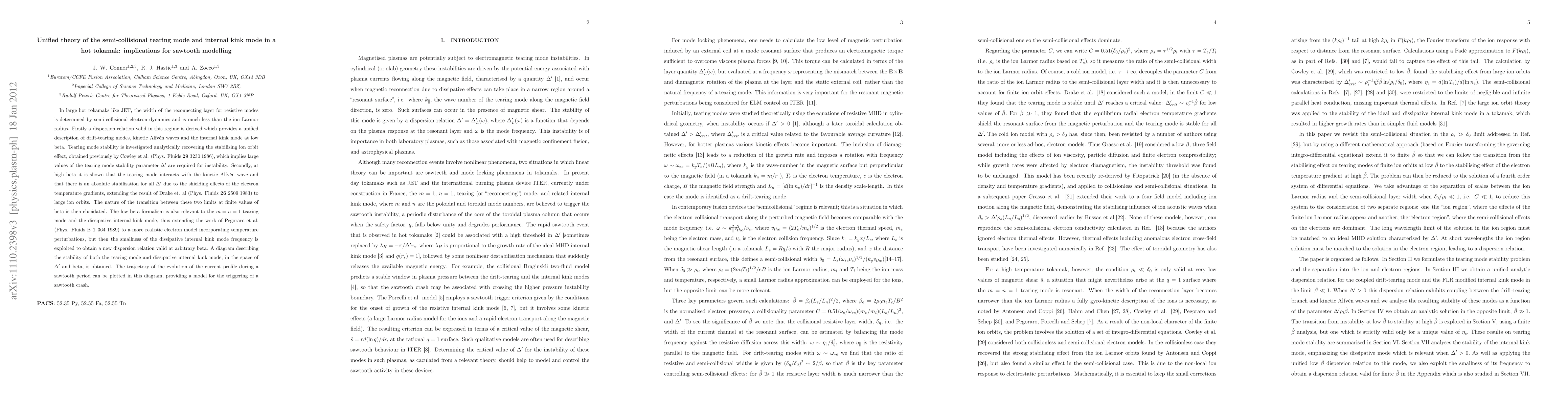 This paper derives a unified dispersion relation for the semi-collisional tearing mode and internal kink mode in hot tokamaks, showing stability implications and interactions with kinetic Alfven waves. It provides a model for sawtooth crash triggering based on current profile evolution.