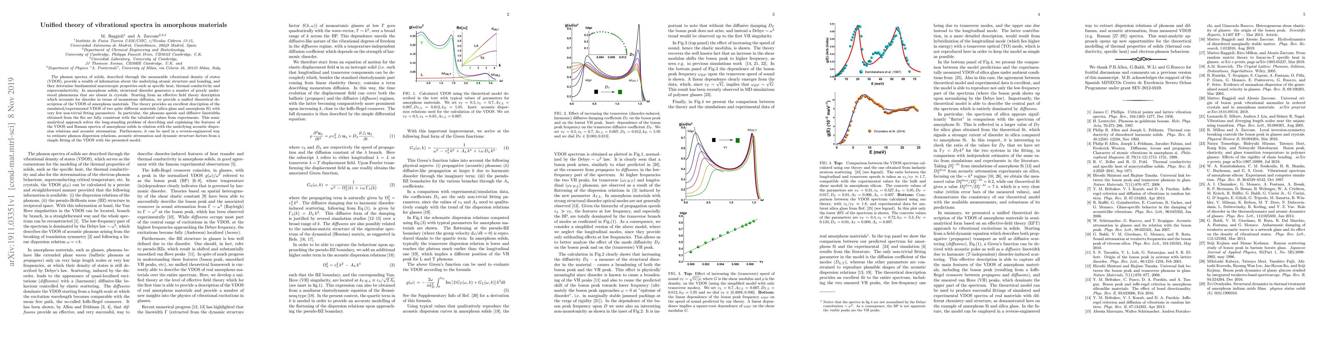 This paper presents a unified theoretical framework for describing the vibrational density of states (VDOS) in amorphous materials, addressing the complexities arising from structural disorder. The proposed effective field theory model accurately fits the simulated and experimental VDOS of materials like silica glass and amorphous Si, providing insights into phonon speeds and diffusive linewidths.