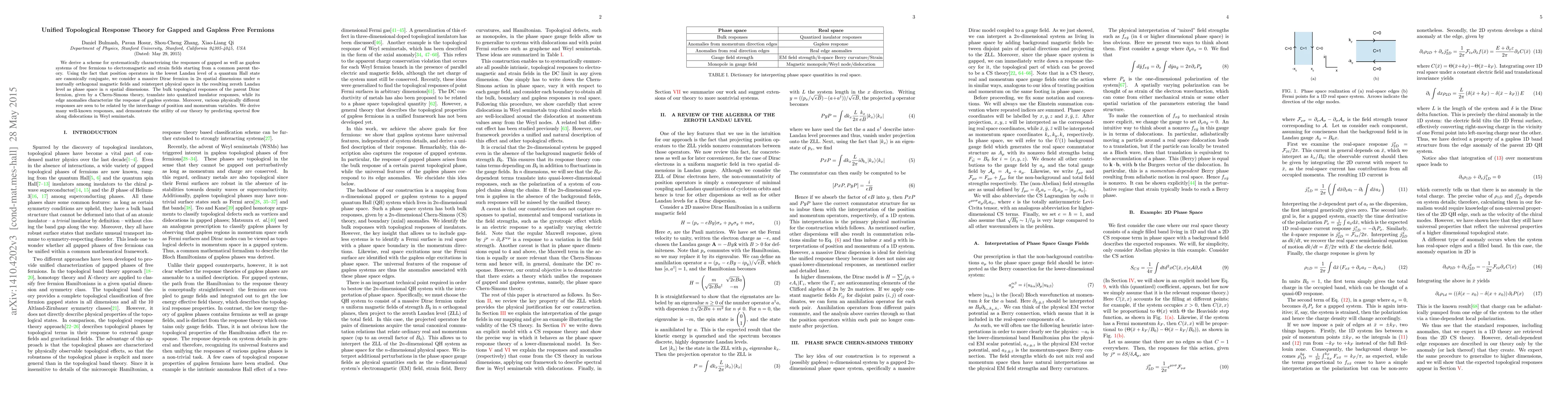 This paper develops a unified topological response theory for both gapped and gapless free fermion systems, deriving responses to electromagnetic and strain fields from a common parent theory. It predicts spectral flow along dislocations in Weyl semimetals, linking various responses through the interchange of position and momentum.