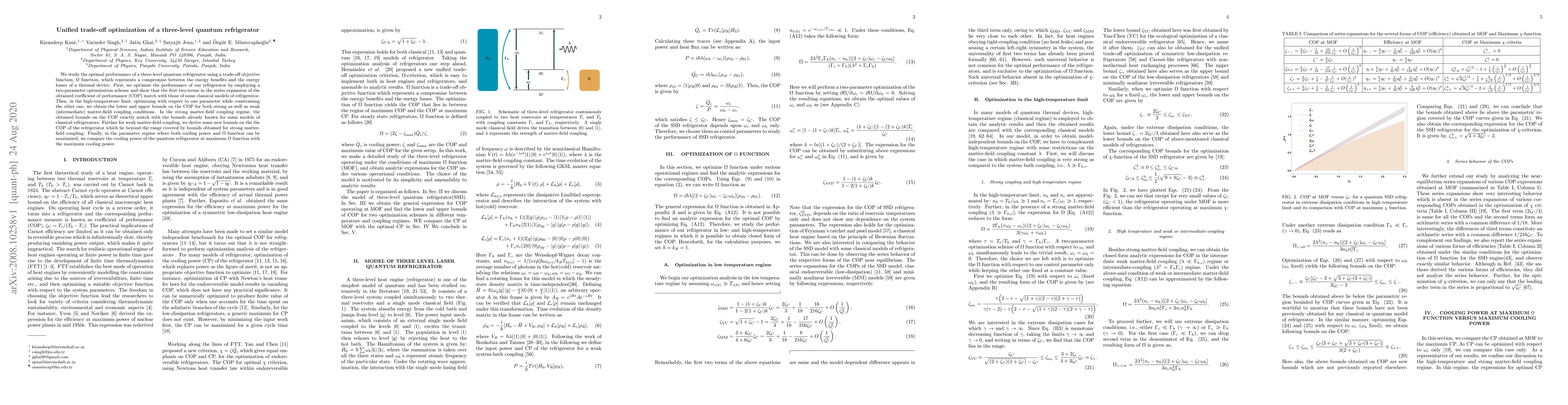 This paper optimizes the performance of a three-level quantum refrigerator using a trade-off objective function, deriving bounds on its coefficient of performance (COP) under different matter-field coupling conditions. It shows that the COP bounds in strong coupling match classical models, while new bounds for weak coupling extend beyond those in strong coupling.