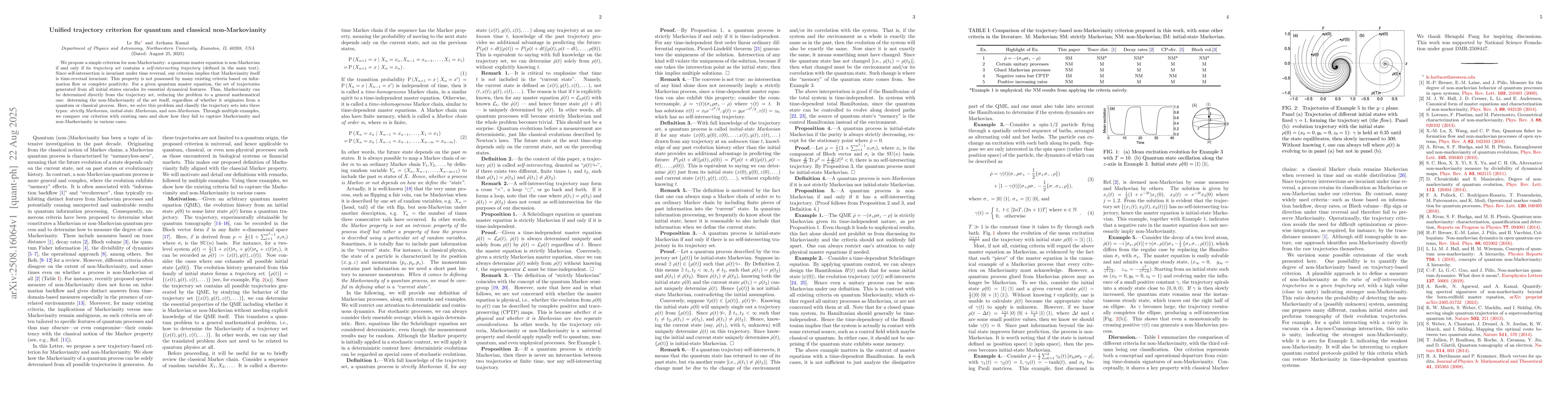 We propose a simple criterion for non-Markovianity: a quantum master equation is non-Markovian if and only if its \textit{trajectory set} contains a \textit{self-intersecting trajectory} (defined in the main text). Since self-intersection is invariant under time reversal, our criterion implies that Markovianity itself is time-reversal invariant: This property is not possessed by many existing criteria based on information flow or complete positivity. For a given quantum master equation, the set of trajectories generated from all initial states encodes its essential dynamical features. Thus, Markovianity can be determined directly from the trajectory set, reducing the problem to a general mathematical one: determing the non-Markovianity of the set itself, regardless of whether it originates from a quantum or classical process. Here, we solve this problem and classify the trajectory sets into three types: \textit{strictly Markovian}, \textit{initial-state Markovian}, and \textit{non-Markovian}. Through multiple examples, we compare our criterion with existing ones and show how they fail to capture Markovianity and non-Markovianity in various cases.