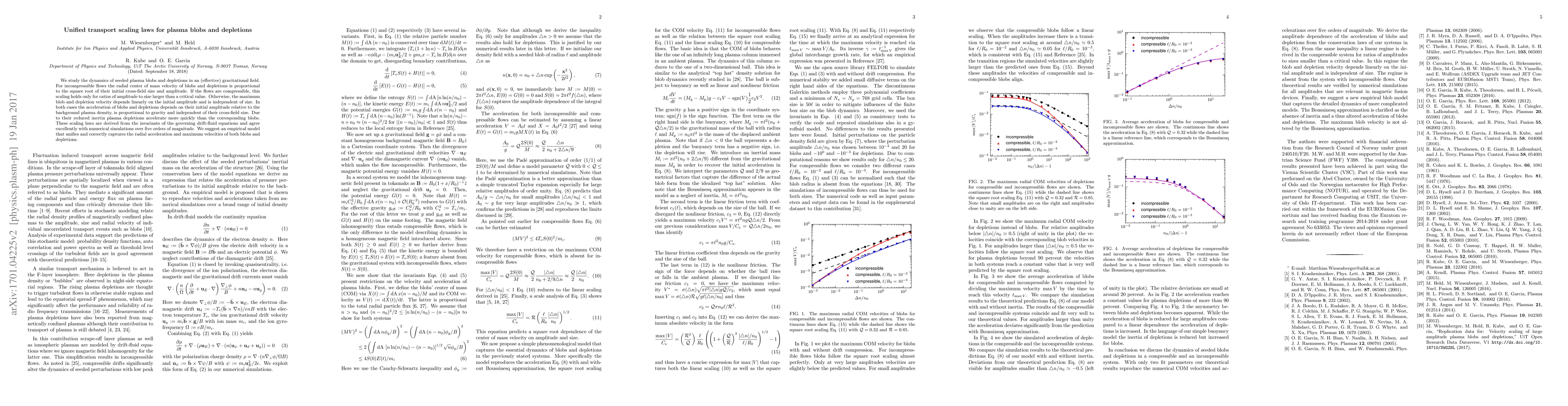 This paper derives unified transport scaling laws for plasma blobs and depletions under gravitational fields, showing that their radial center of mass velocity scales with the square root of their initial size and amplitude for incompressible flows, while compressible flows exhibit different scaling behaviors. An empirical model is proposed to accurately capture these dynamics.