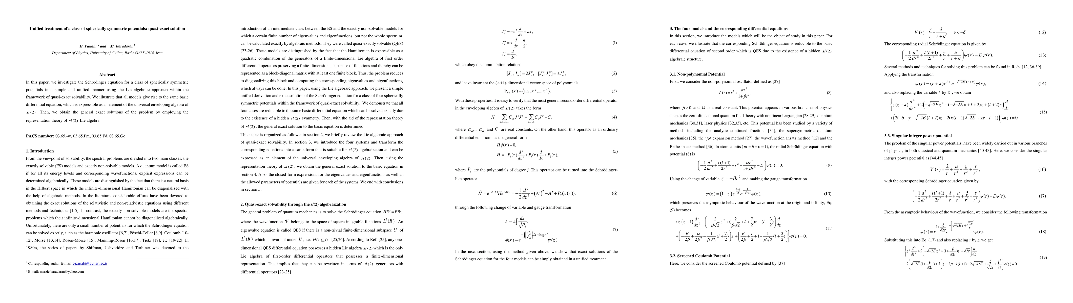 This paper employs the Lie algebraic approach to solve the Schrödinger equation for spherically symmetric potentials, revealing that all models lead to a common differential equation expressible in sl(2). Exact solutions are derived using the representation theory of the sl(2) Lie algebra.