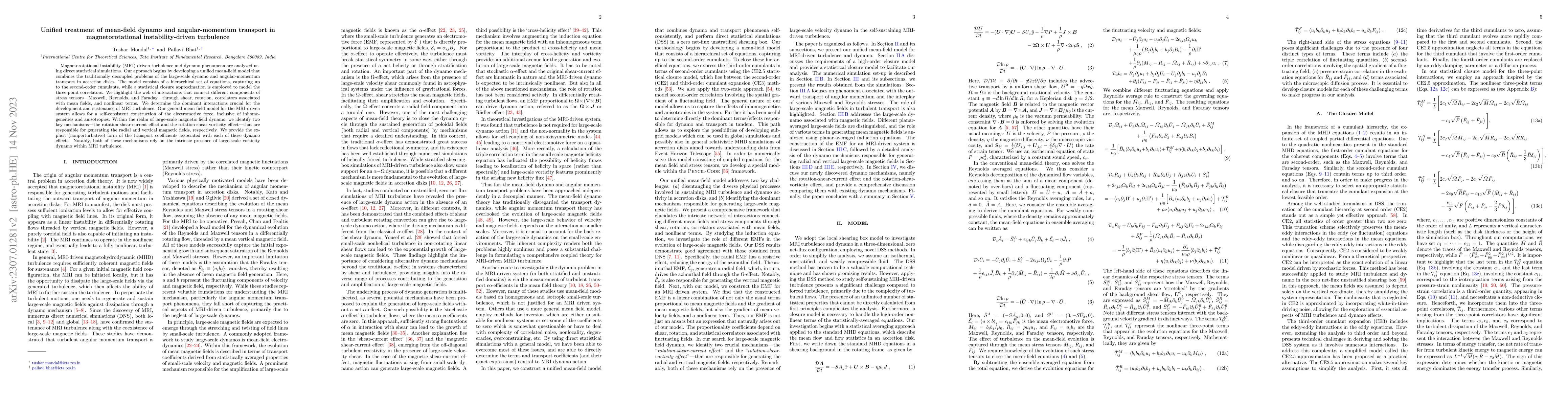 This paper develops a unified mean-field model to analyze MRI-driven turbulence, combining the large-scale dynamo and angular-momentum transport. It identifies two key mechanisms, the rotation-shear-current and rotation-shear-vorticity effects, responsible for generating radial and vertical magnetic fields, respectively.