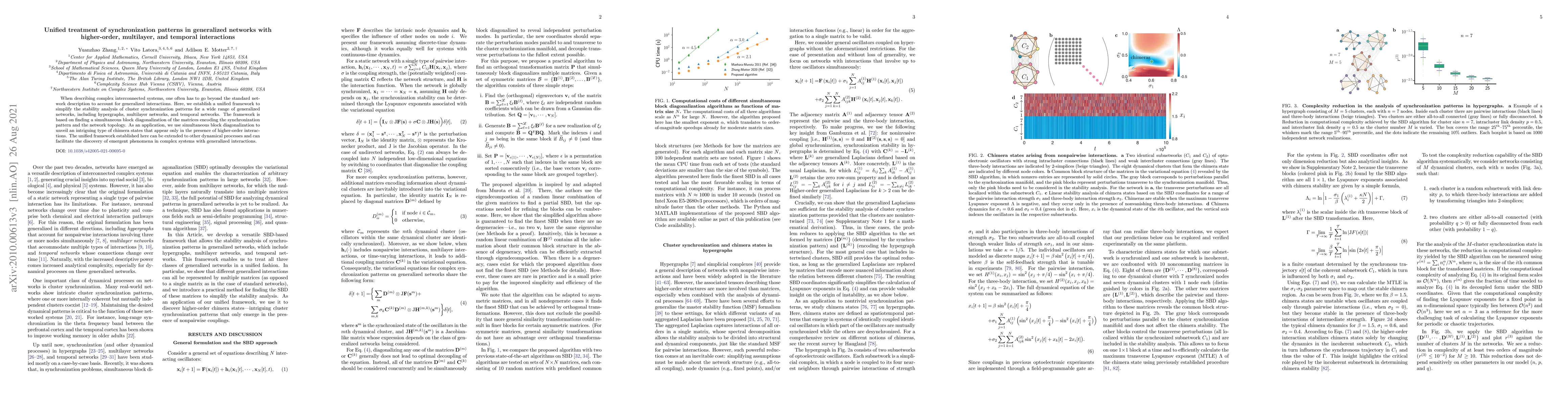 When describing complex interconnected systems, one often has to go beyond the standard network description to account for generalized interactions. Here, we establish a unified framework to simplify the stability analysis of cluster synchronization patterns for a wide range of generalized networks, including hypergraphs, multilayer networks, and temporal networks. The framework is based on finding a simultaneous block diagonalization of the matrices encoding the synchronization pattern and the network topology. As an application, we use simultaneous block diagonalization to unveil an intriguing type of chimera states that appear only in the presence of higher-order interactions. The unified framework established here can be extended to other dynamical processes and can facilitate the discovery of emergent phenomena in complex systems with generalized interactions.