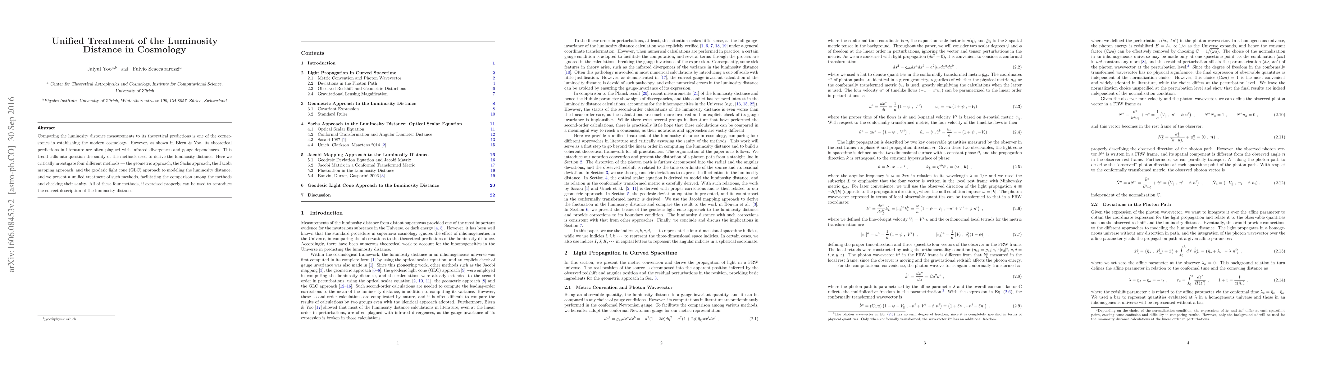Comparing the luminosity distance measurements to its theoretical predictions is one of the cornerstones in establishing the modern cosmology. However, as shown in Biern & Yoo, its theoretical predictions in literature are often plagued with infrared divergences and gauge-dependences. This trend calls into question the sanity of the methods used to derive the luminosity distance. Here we critically investigate four different methods --- the geometric approach, the Sachs approach, the Jacobi mapping approach, and the geodesic light cone (GLC) approach to modeling the luminosity distance, and we present a unified treatment of such methods, facilitating the comparison among the methods and checking their sanity. All of these four methods, if exercised properly, can be used to reproduce the correct description of the luminosity distance.
