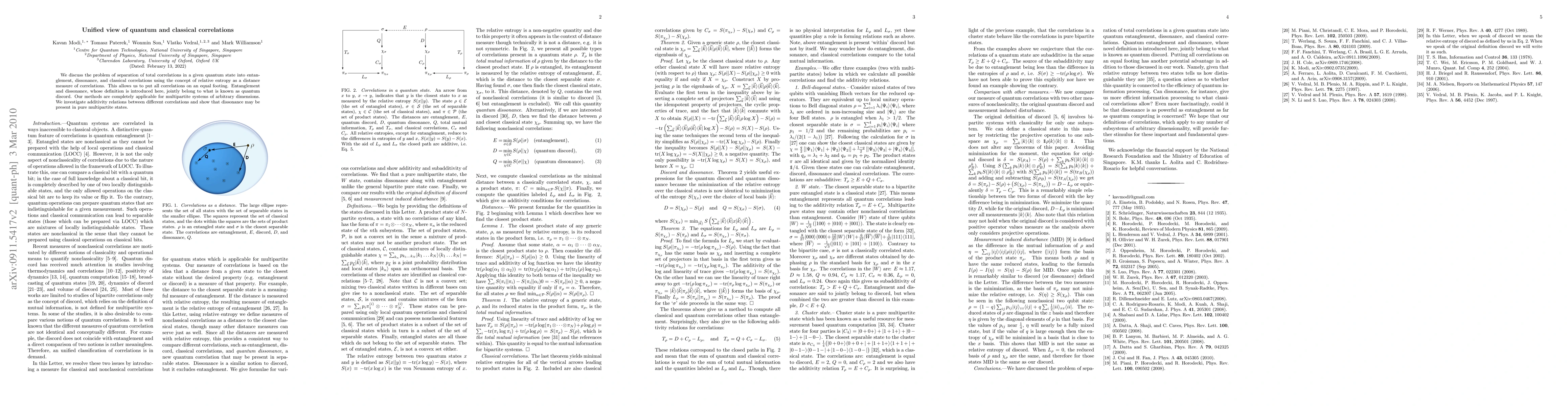 We discuss the problem of the separation of total correlations in a given quantum state into entanglement, dissonance, and classical correlations using the concept of relative entropy as a distance measure of correlations. This allows us to put all correlations on an equal footing. Entanglement and dissonance, whose definition is introduced here, jointly belong to what is known as quantum discord. Our methods are completely applicable for multipartite systems of arbitrary dimensions. We investigate additivity relations between different correlations and show that dissonance may be present in pure multipartite states.