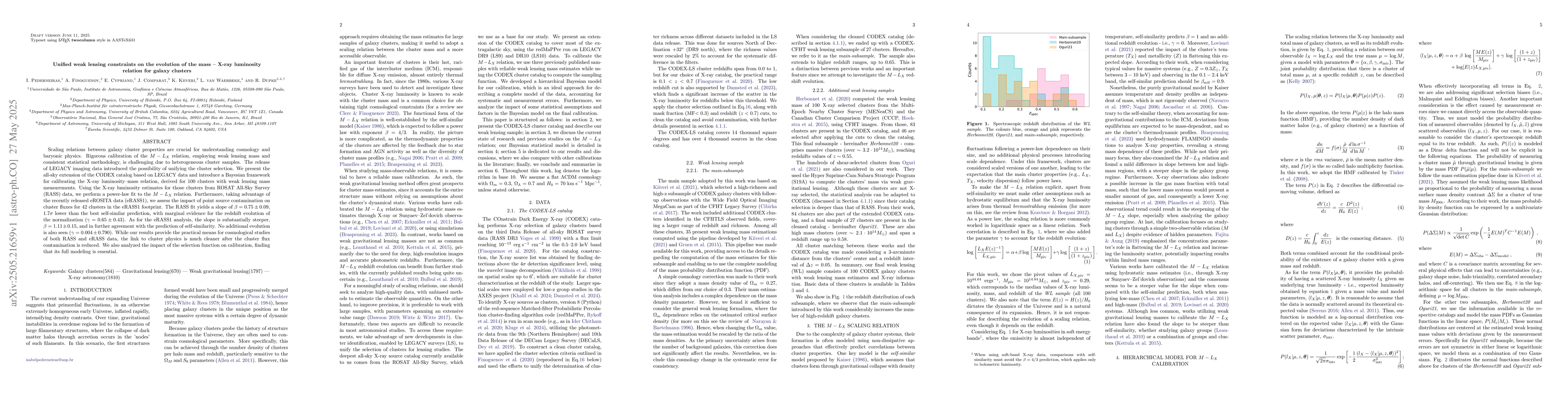 The research presents an all-sky extension of the CODEX catalog based on LEGACY data, employing a Bayesian framework to calibrate the X-ray luminosity-mass relation for 100 clusters with weak lensing mass measurements. It also assesses the impact of point source contamination on cluster fluxes using ROSAT All-Sky Survey (RASS) and eROSITA (eRASS1) data.