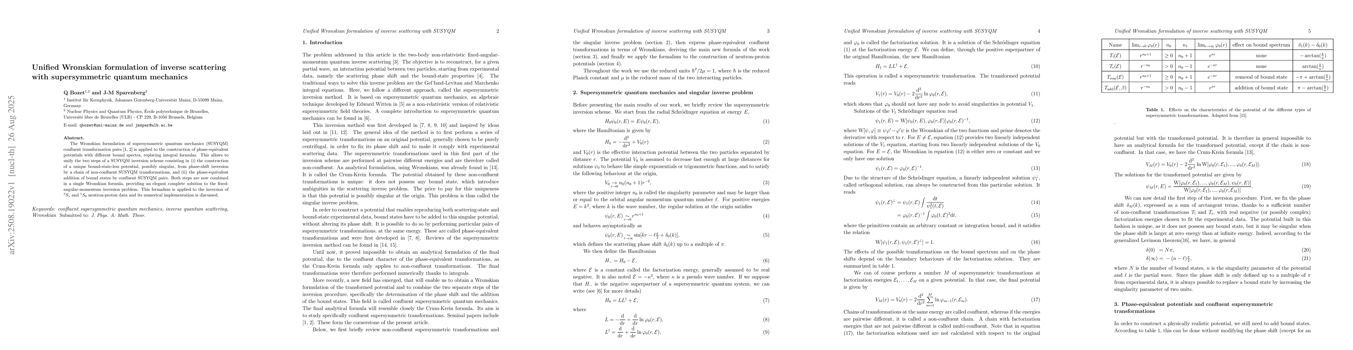 The Wronskian formulation of supersymmetric quantum mechanics (SUSYQM) confluent transformation pairs is applied to the construction of phase-equivalent potentials with different bound spectra, replacing integral formulas. This allows to unify the two steps of a SUSYQM inversion scheme consisting in (i) the construction of a unique bound-state-less potential, possibly singular, from phase-shift inversion by a chain of non-confluent SUSYQM transformations, and (ii) the phase-equivalent addition of bound states by confluent SUSYQM pairs. Both steps are now combined in a single Wronskian formula, providing an elegant complete solution to the fixedangular-momentum inversion problem. This formalism is applied to the inversion of 3S1 and 1S0 neutron-proton data and its numerical implementation is discussed.