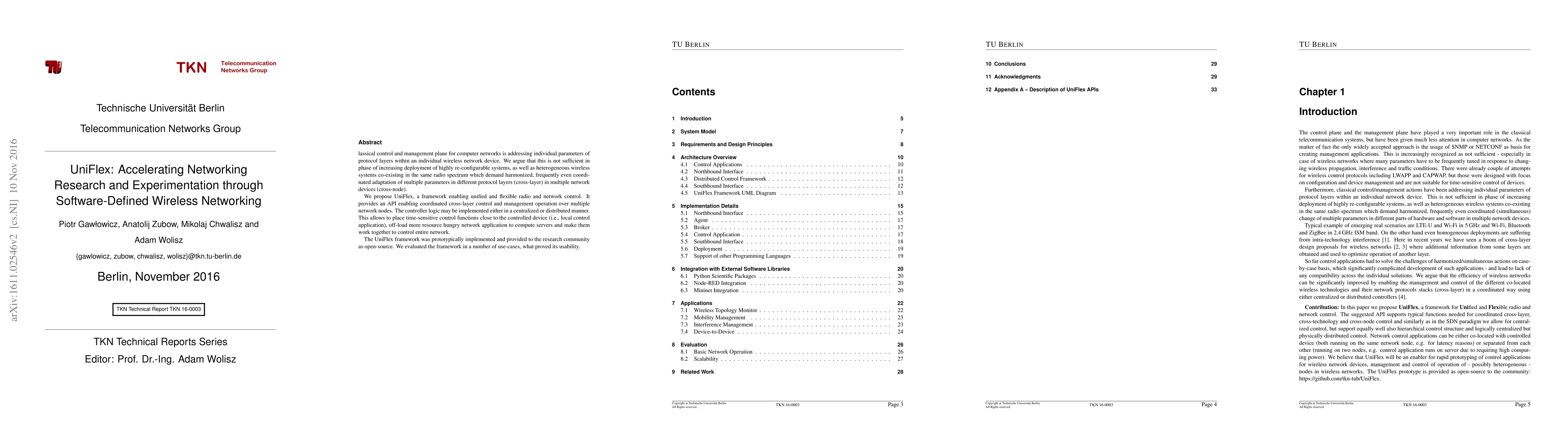 Classical control and management plane for computer networks is addressing individual parameters of protocol layers within an individual wireless network device. We argue that this is not sufficient in phase of increasing deployment of highly re-configurable systems, as well as heterogeneous wireless systems co-existing in the same radio spectrum which demand harmonized, frequently even coordinated adaptation of multiple parameters in different protocol layers (cross-layer) in multiple network devices (cross-node). We propose UniFlex, a framework enabling unified and flexible radio and network control. It provides an API enabling coordinated cross-layer control and management operation over multiple network nodes. The controller logic may be implemented either in a centralized or distributed manner. This allows to place time-sensitive control functions close to the controlled device (i.e., local control application), off-load more resource hungry network application to compute servers and make them work together to control entire network. The UniFlex framework was prototypically implemented and provided to the research community as open-source. We evaluated the the framework in a number of use-cases, what proved its usability.