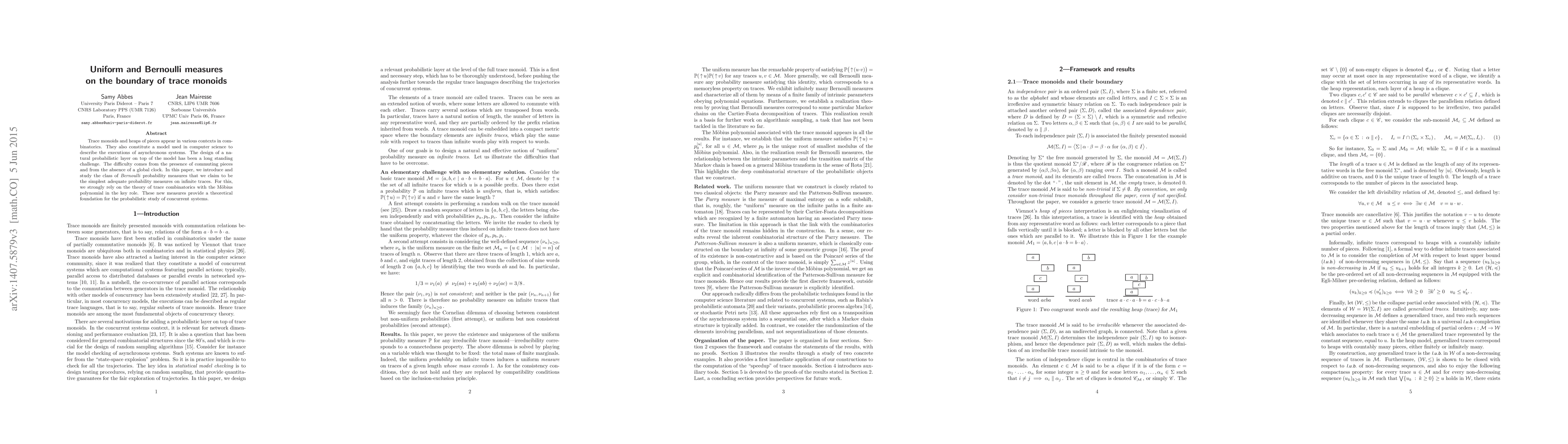 This research introduces Bernoulli probability measures for trace monoids, addressing a long-standing challenge in modeling asynchronous systems. Leveraging trace combinatorics, these measures offer a theoretical foundation for probabilistic study of concurrent systems, simplifying the complexities of commuting pieces and lack of global clock.