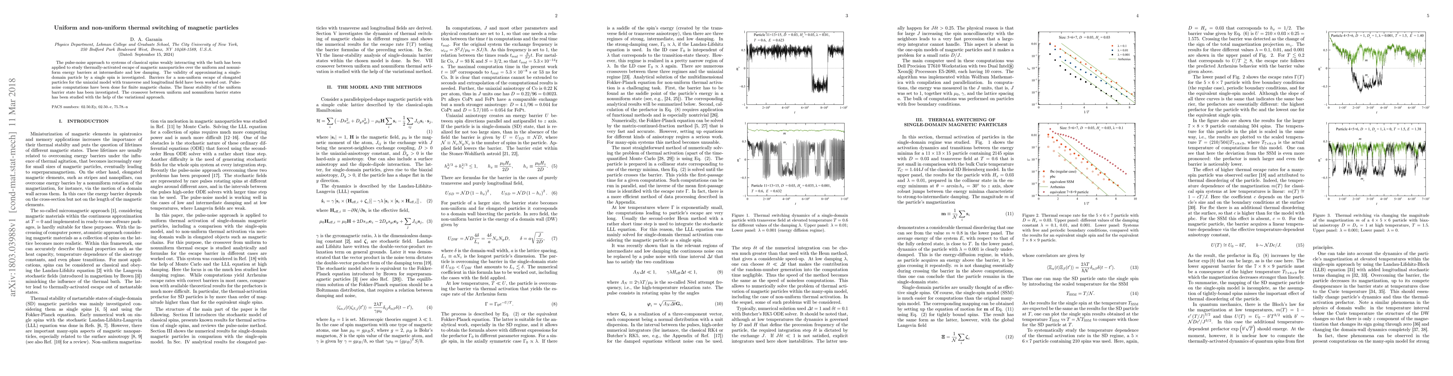 Researchers studied thermal switching of magnetic nanoparticles over uniform and non-uniform energy barriers using a pulse-noise approach, exploring the validity of approximating single-domain particles as single spins and investigating linear stability and crossover between barrier states.