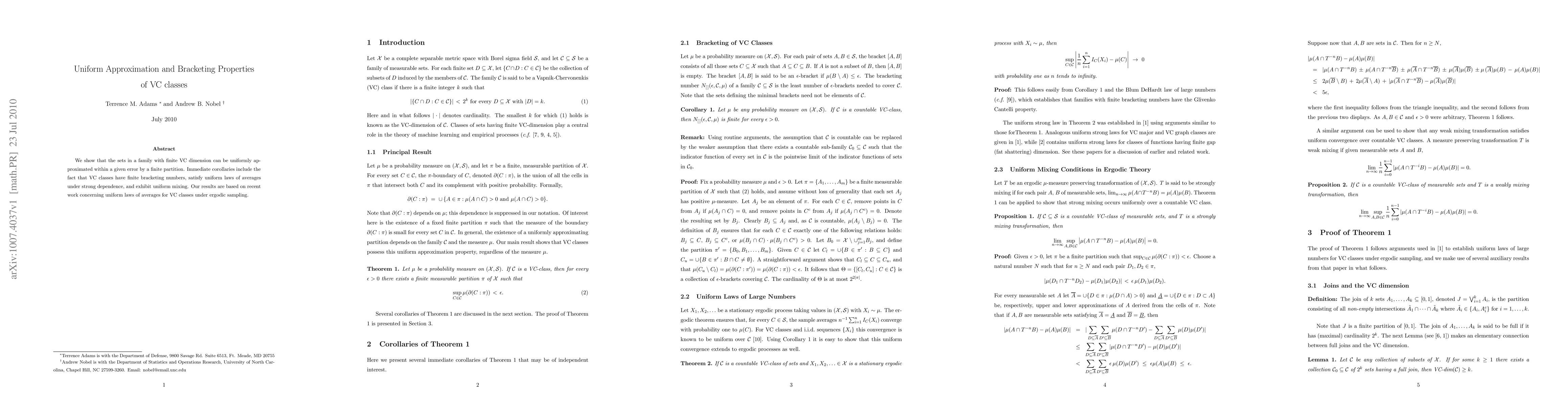 This paper demonstrates that sets within VC classes with finite VC dimension can be uniformly approximated by finite partitions, leading to conclusions about their finite bracketing numbers, satisfaction of uniform laws of averages under strong dependence, and uniform mixing properties. These findings build on recent advancements in understanding uniform laws of averages for VC classes under ergodic sampling.