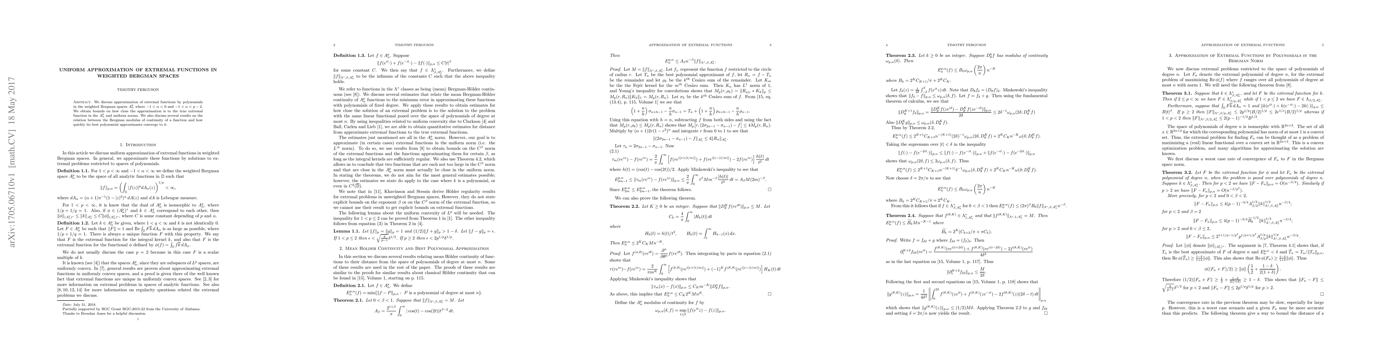 We discuss approximation of extremal functions by polynomials in the weighted Bergman spaces $A^p_\alpha$ where $-1 < \alpha < 0$ and $-1 < \alpha < p-2$. We obtain bounds on how close the approximation is to the true extremal function in the $A^p_\alpha$ and uniform norms. We also discuss several results on the relation between the Bergman modulus of continuity of a function and how quickly its best polynomial approximants converge to it.