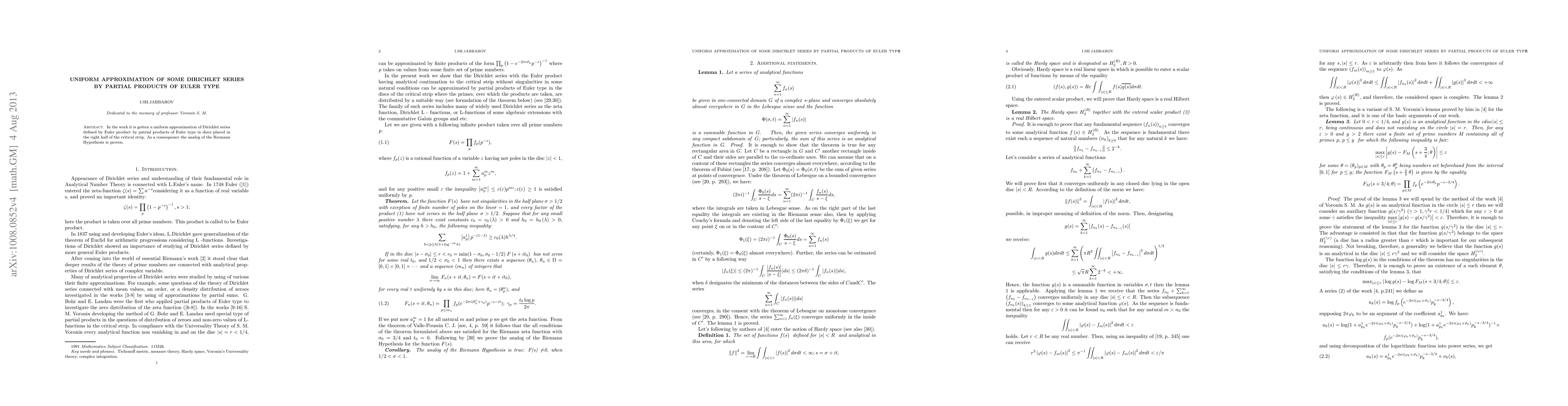 Researchers show that certain Dirichlet series can be approximated by partial products of Euler type, proving an analog of the Riemann Hypothesis for these series.