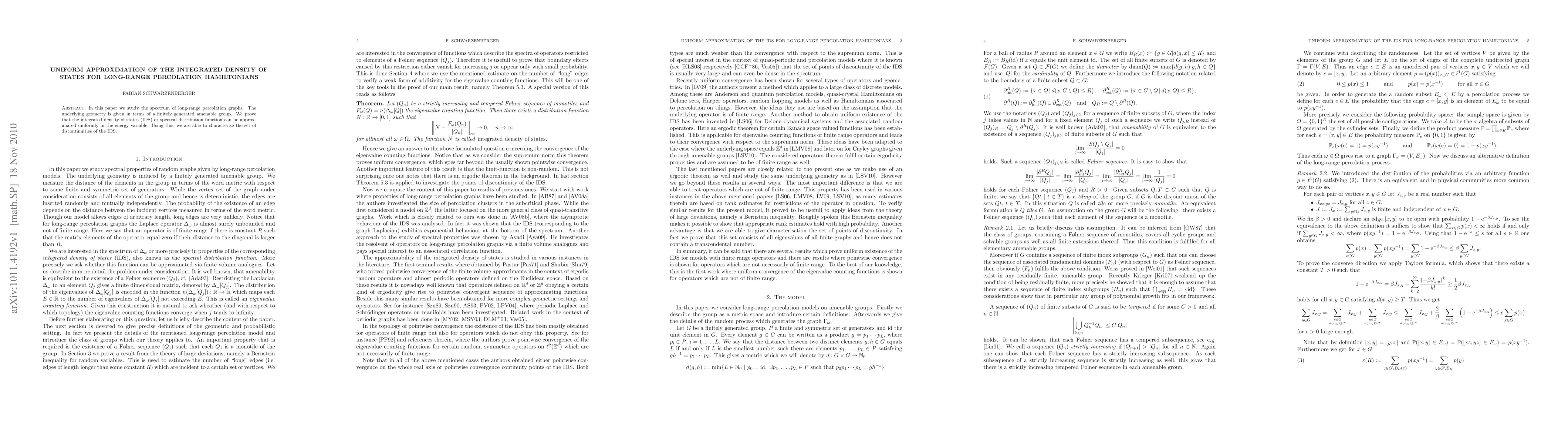 This paper investigates the spectrum of long-range percolation graphs on finitely generated amenable groups, proving uniform approximation of the integrated density of states (IDS) and characterizing the set of discontinuities of the IDS.