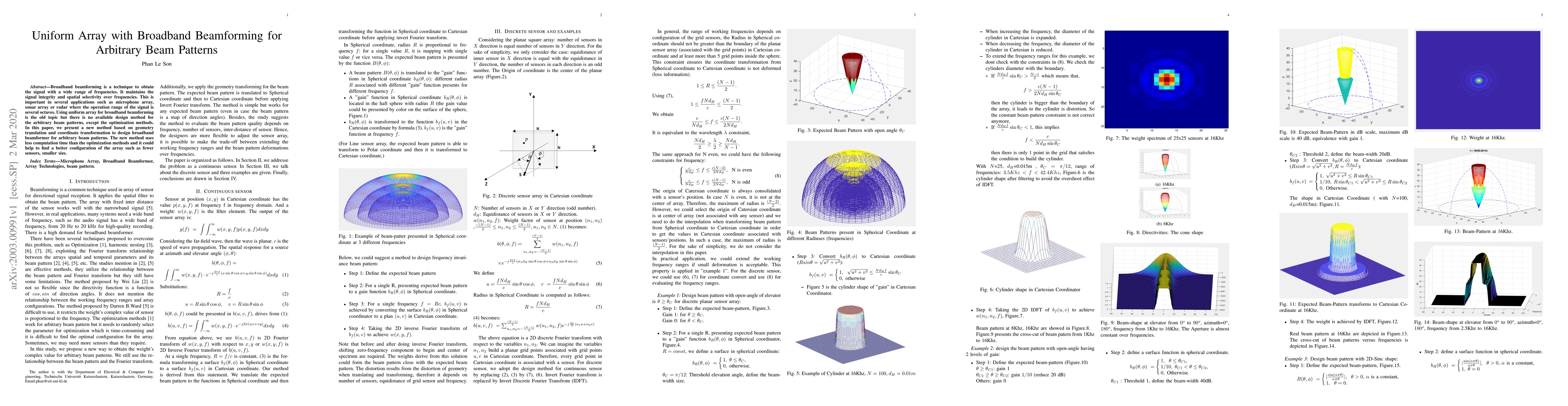 Broadband beamforming is a technique to obtain the signal with a wide range of frequencies. It maintains the signal integrity and spatial selectivity over frequencies. This is important in several applications such as microphone array, sonar array or radar where the operation range of the signal is several octaves. Using uniform array for broadband beamforming is the old topic but there is no available design method for the arbitrary beam patterns, except the optimization methods. In this paper, we present a new method based on geometry translation and coordinate transformation to design broadband beamformer for arbitrary beam patterns. The new method uses less computation time than the optimization methods and it could help to find a better configuration of the array such as fewer sensors, smaller size.