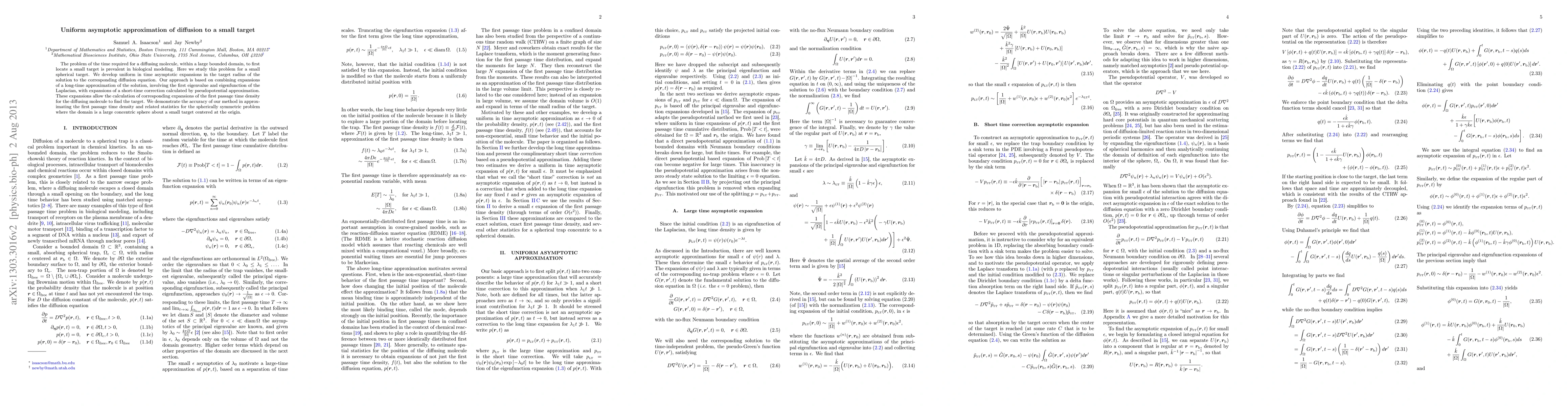 This paper develops uniform asymptotic expansions to approximate the time for a diffusing molecule to locate a small spherical target within a large domain, combining short-time and long-time expansions for accuracy. The method is validated for the spherically symmetric problem.