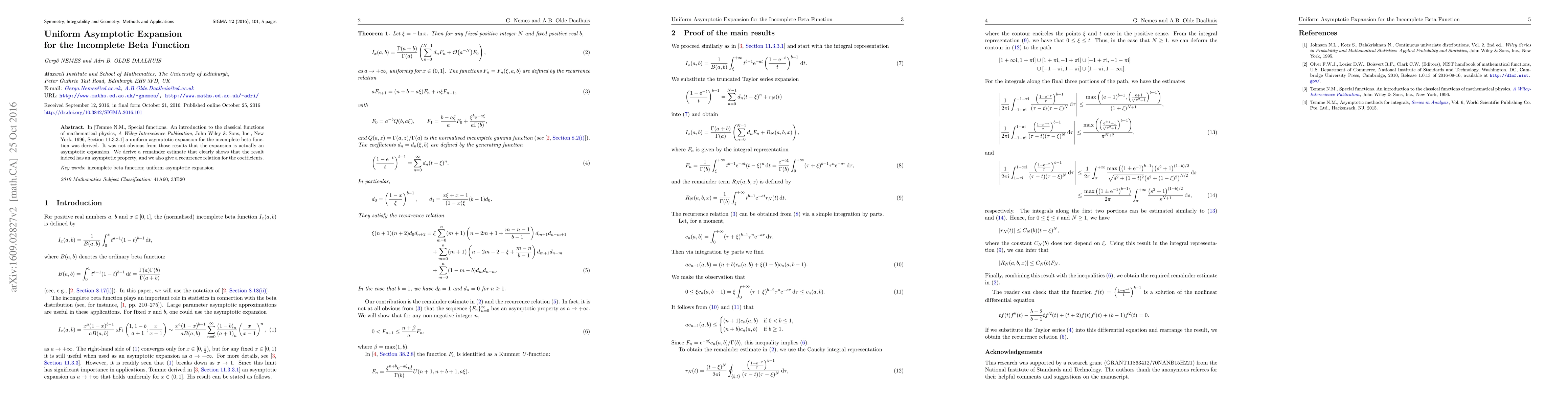 This paper derives a uniform asymptotic expansion for the incomplete beta function and provides a remainder estimate to confirm its asymptotic nature. It also introduces a recurrence relation for the coefficients of the expansion.