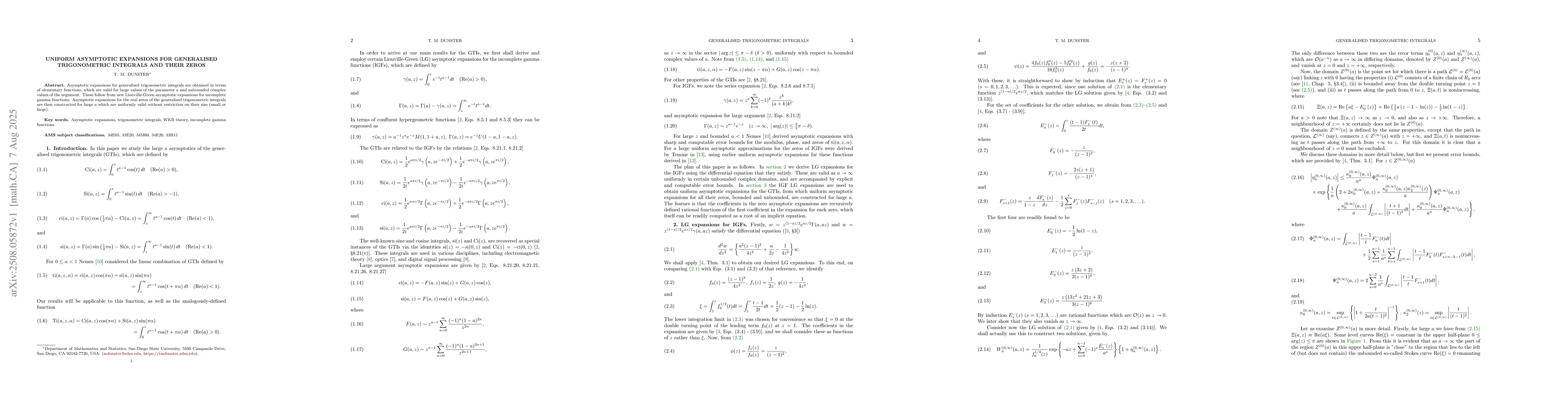 Asymptotic expansions for generalised trigonometric integrals are obtained in terms of elementary functions, which are valid for large values of the parameter $a$ and unbounded complex values of the argument. These follow from new Liouville-Green asymptotic expansions for incomplete gamma functions. Asymptotic expansions for the real zeros of the generalised trigonometric integrals are then constructed for large $a$ which are uniformly valid without restriction on their size (small or large).