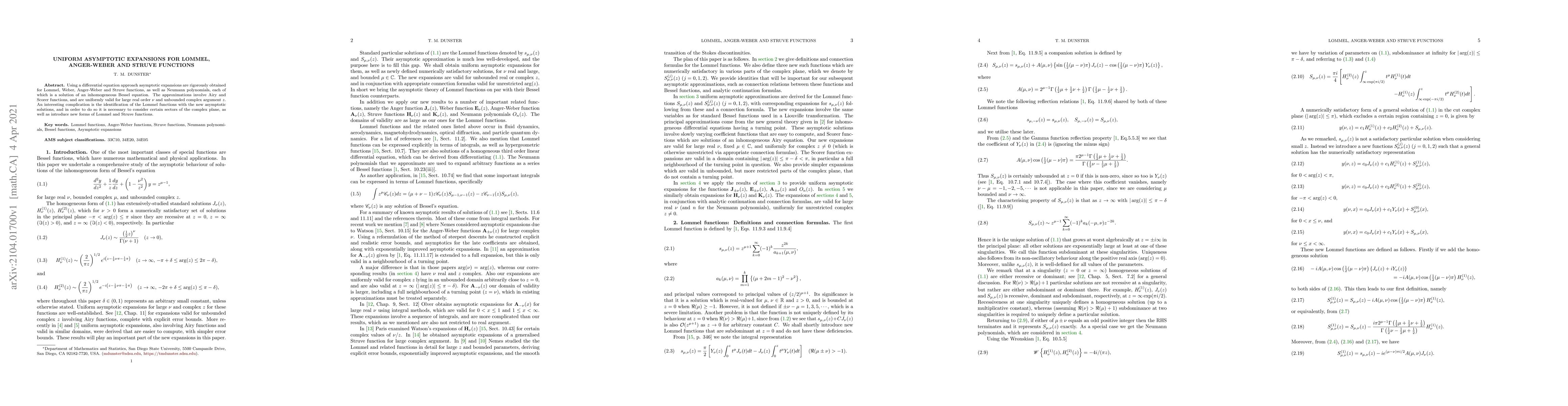 This research paper rigorously derives uniform asymptotic expansions for Lommel, Anger-Weber, and Struve functions, along with Neumann polynomials, using a differential equation approach. The expansions involve Airy and Scorer functions and are valid for large real order and complex arguments, with special attention to identifying Lommel functions within the new asymptotic solutions.