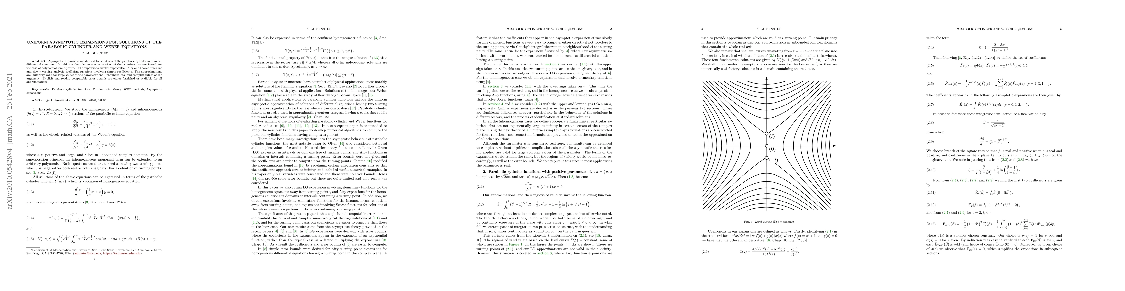 Asymptotic expansions are derived for solutions of the parabolic cylinder and Weber differential equations. In addition the inhomogeneous versions of the equations are considered, for the case of polynomial forcing terms. The expansions involve exponential, Airy and Scorer functions and slowly varying analytic coefficient functions involving simple coefficients. The approximations are uniformly valid for large values of the parameter and unbounded real and complex values of the argument. Explicit and readily computable error bounds are either furnished or available for all approximations.