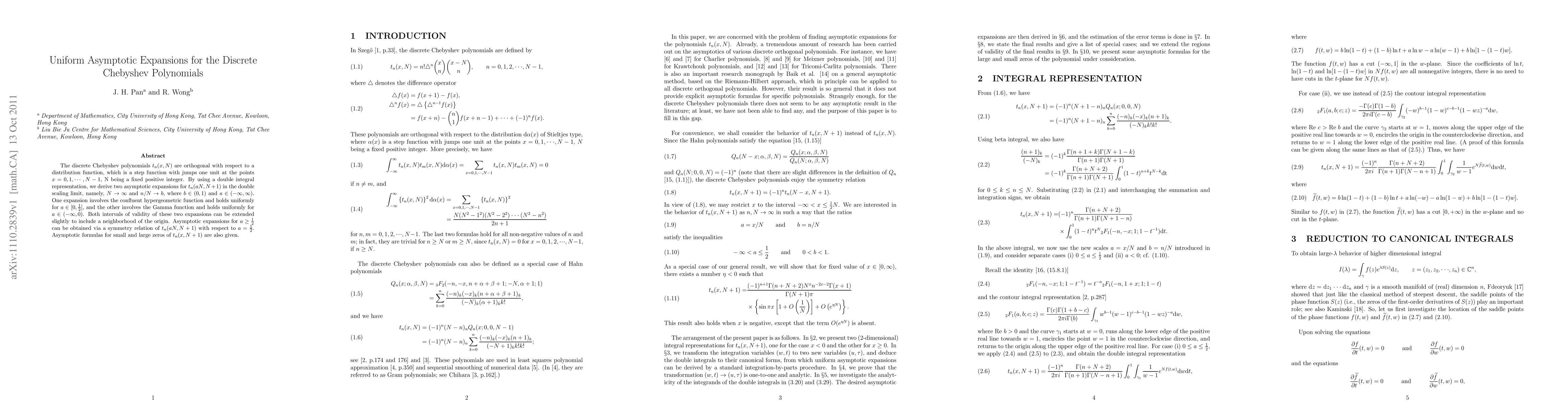 This paper derives uniform asymptotic expansions for discrete Chebyshev polynomials $t_n(x,N)$ using a double integral representation. It provides two expansions in the double scaling limit, one involving the confluent hypergeometric function for $a\in[0,1/2]$ and another involving the Gamma function for $a\in(-\infty, 0)$, with both expansions extended near the origin.
