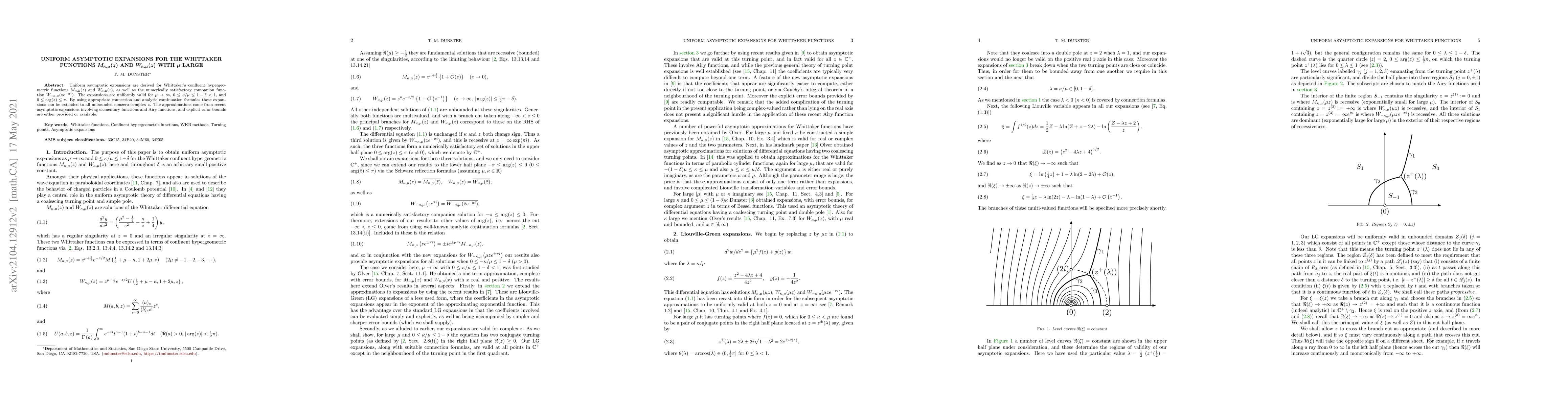 This paper derives uniform asymptotic expansions for Whittaker's confluent hypergeometric functions $M_{\kappa,\mu}(z)$ and $W_{\kappa,\mu}(z)$ as $\mu$ becomes large, with applications to complex $z$. The expansions are valid for $0 \leq \kappa/\mu \leq 1-\delta <1$ and $0 \leq \arg(z) \leq \pi$, and are based on recent asymptotic methods involving elementary and Airy functions.