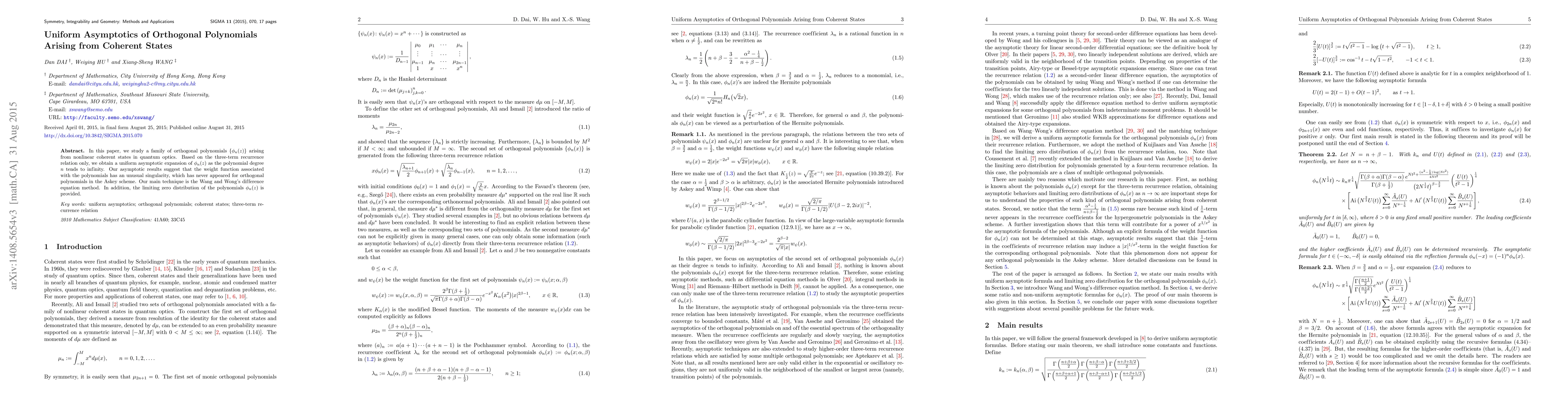 In this paper, we study a family of orthogonal polynomials $\{\phi_n(z)\}$ arising from nonlinear coherent states in quantum optics. Based on the three-term recurrence relation only, we obtain a uniform asymptotic expansion of $\phi_n(z)$ as the polynomial degree $n$ tends to infinity. Our asymptotic results suggest that the weight function associated with the polynomials has an unusual singularity, which has never appeared for orthogonal polynomials in the Askey scheme. Our main technique is the Wang and Wong's difference equation method. In addition, the limiting zero distribution of the polynomials $\phi_n(z)$ is provided.