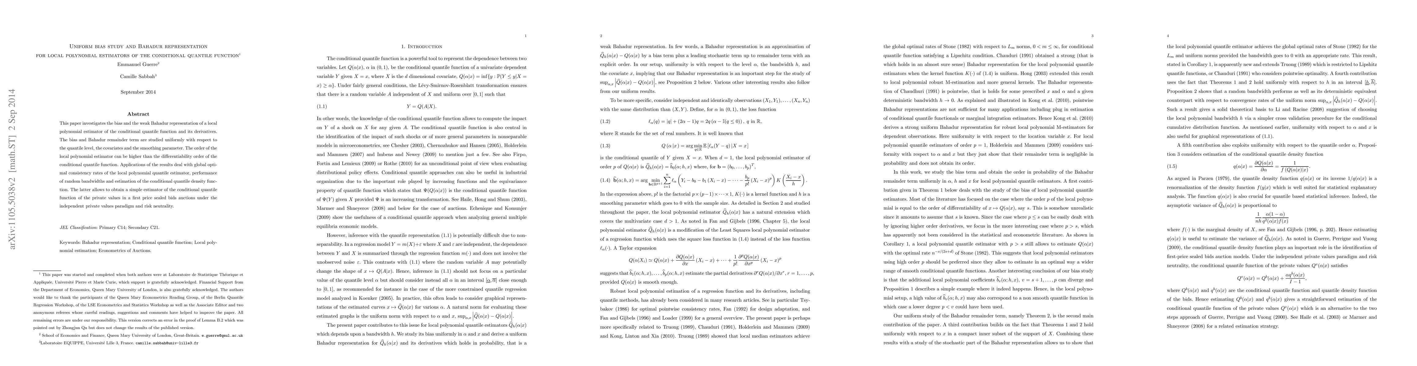 This paper studies the uniform bias and Bahadur representation of local polynomial estimators for the conditional quantile function, focusing on higher-order polynomials and applications to optimal consistency rates and random bandwidth performance. It also explores the estimation of conditional quantile density functions for first-price sealed bid auctions.