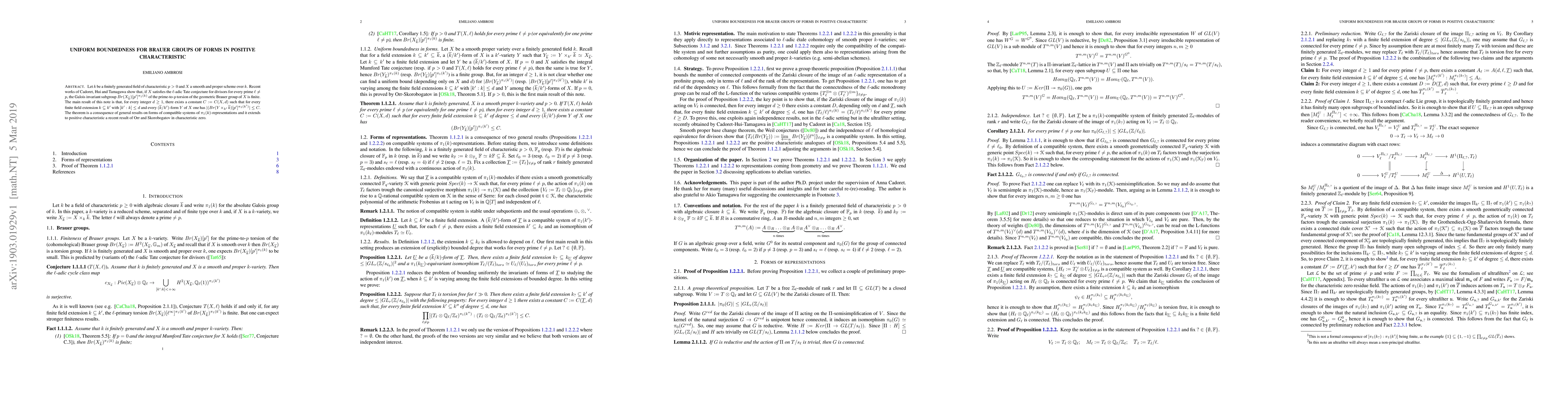 Let $k$ be a finitely generated field of characteristic $p>0$ and $X$ a smooth and proper scheme over $k$. Recent works of Cadoret, Hui and Tamagawa show that, if $X$ satisfies the $\ell$-adic Tate conjecture for divisors for every prime $\ell\neq p$, the Galois invariant subgroup $Br(X_{\overline k})[p']^{\pi_1(k)}$ of the prime-to-$p$ torsion of the geometric Brauer group of $X$ is finite. The main result of this note is that, for every integer $d\geq 1$, there exists a constant $C:=C(X,d)$ such that for every finite field extension $k \subseteq k'$ with $[k':k]\leq d$ and every $(\overline k/k')$-form $Y$ of $X$ one has $|(Br(Y\times_{k'}\overline k)[p']^{\pi_1(k')}|\leq C$. The theorem is a consequence of general results on forms of compatible systems of $\pi_1(k)$-representations and it extends to positive characteristic a recent result of Orr and Skorobogatov in characteristic zero.