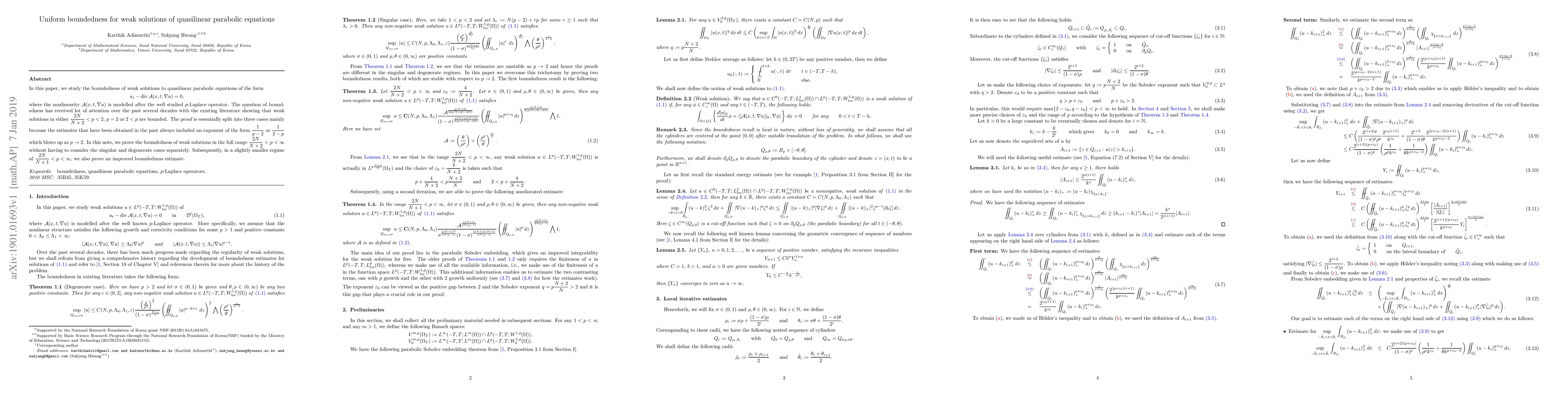 This paper proves the uniform boundedness of weak solutions to quasilinear parabolic equations, addressing the full range of $p$ values from $\frac{2N}{N+2}$ to $\infty$ without separate treatment for singular cases, and providing an improved estimate in a slightly narrower regime.