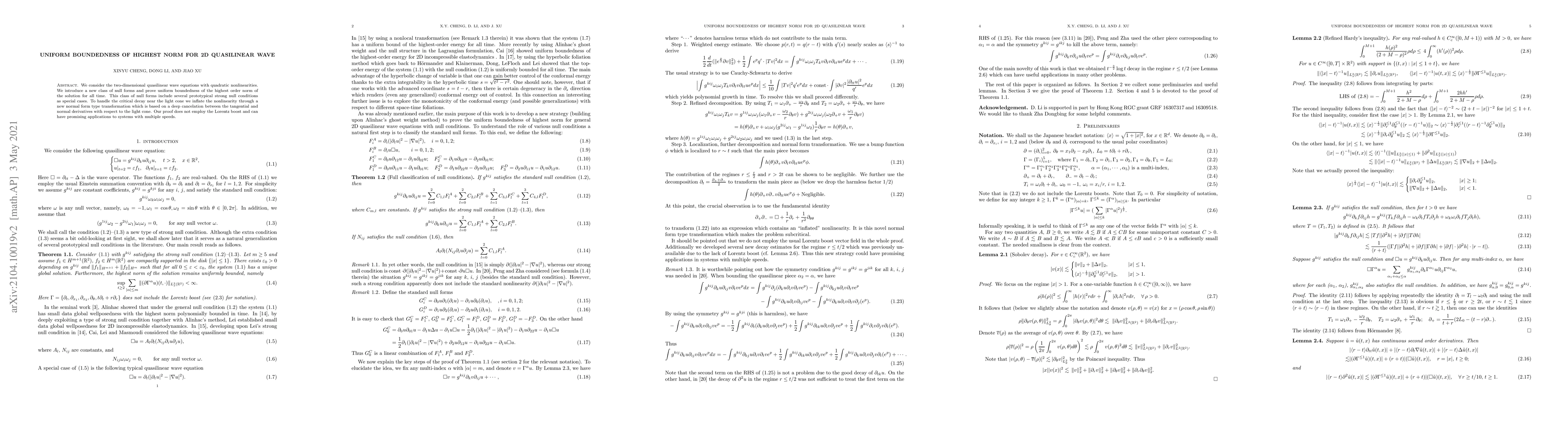 Researchers prove uniform boundedness of a solution to 2D quasilinear wave equations with quadratic nonlinearities, overcoming critical decay near the light cone through a new normal form transformation.