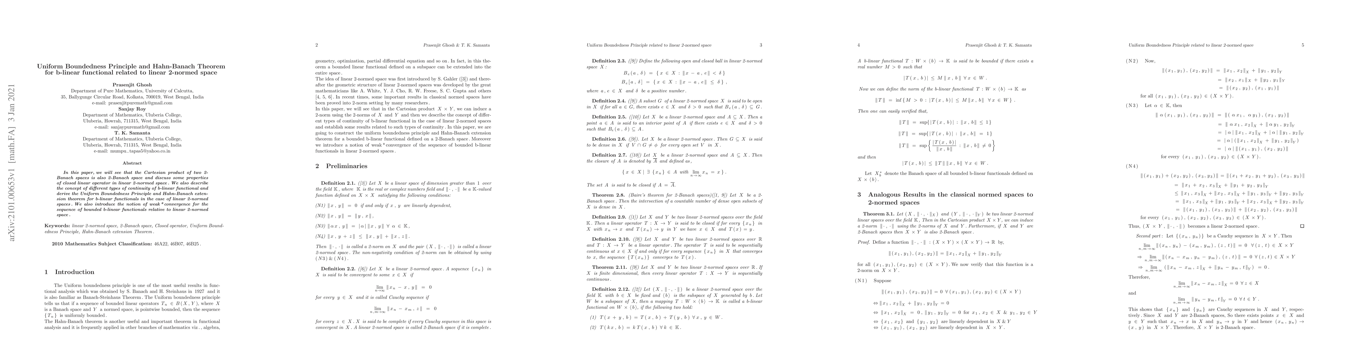 In this paper, we will see that the Cartesian product of two 2-Banach spaces is also 2-Banach space and discuss some properties of closed linear operator in linear 2-normed space. We also describe the concept of different types of continuity of b-linear functional and derive the Uniform Boundedness Principle and Hahn-Banach extension theorem for b-linear functionals in the case of linear 2-normed spaces. We also introduce the notion of weak*convergence for the sequence of bounded b-linear functionals relative to linear 2-normed space.
