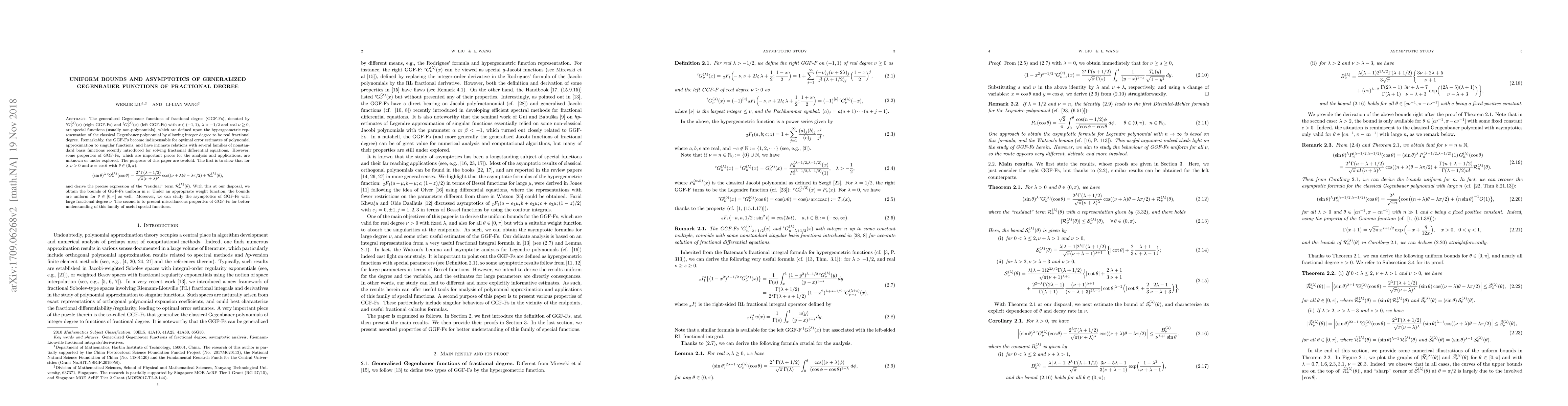 The generalised Gegenbauer functions of fractional degree (GGF-Fs), denoted by ${}^{r\!}G^{(\lambda)}_\nu(x)$ (right GGF-Fs) and ${}^{l}G^{(\lambda)}_\nu(x)$ (left GGF-Fs) with $x\in (-1,1),$ $\lambda>-1/2$ and real $\nu\ge 0,$ are special functions (usually non-polynomials), which are defined upon the hypergeometric representation of the classical Gegenbauer polynomial by allowing integer degree to be real fractional degree. Remarkably, the GGF-Fs become indispensable for optimal error estimates of polynomial approximation to singular functions, and have intimate relations with several families of nonstandard basis functions recently introduced for solving fractional differential equations. However, some properties of GGF-Fs, which are important pieces for the analysis and applications, are unknown or under explored. The purposes of this paper are twofold. The first is to show that for $\lambda,\nu>0$ and $x=\cos\theta$ with $\theta\in (0,\pi),$ \begin{equation*}\label{IntRep-0N} (\sin \varphi)^{\lambda}\,{}^{r\!}G_\nu^{(\lambda)}(\cos \varphi)= \frac{2^\lambda\Gamma(\lambda+1/2)}{\sqrt{\pi} {(\nu+\lambda)^{\lambda}}} \, {\cos ((\nu+\lambda)\varphi- \lambda\pi/2)} +{\mathcal R}_\nu^{(\lambda)} (\varphi), \end{equation*} and derive the precise expression of the "residual" term ${\mathcal R}_\nu^{(\lambda)} (\varphi).$ With this at our disposal, we obtain the bounds of GGF-Fs uniform in $\nu.$ Under an appropriate weight function, the bounds are uniform for $\theta\in [0,\pi]$ as well. Moreover, we can study the asymptotics of GGF-Fs with large fractional degree $\nu.$ The second is to present miscellaneous properties of GGF-Fs for better understanding of this family of useful special functions.
