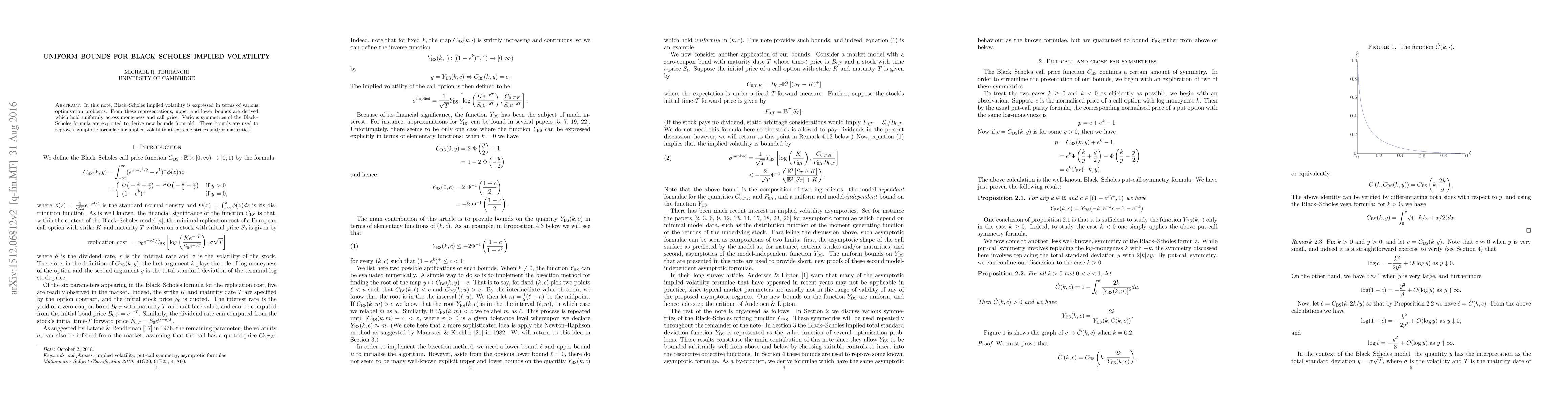 In this note, Black--Scholes implied volatility is expressed in terms of various optimisation problems. From these representations, upper and lower bounds are derived which hold uniformly across moneyness and call price. Various symmetries of the Black--Scholes formula are exploited to derive new bounds from old. These bounds are used to reprove asymptotic formulae for implied volatility at extreme strikes and/or maturities.