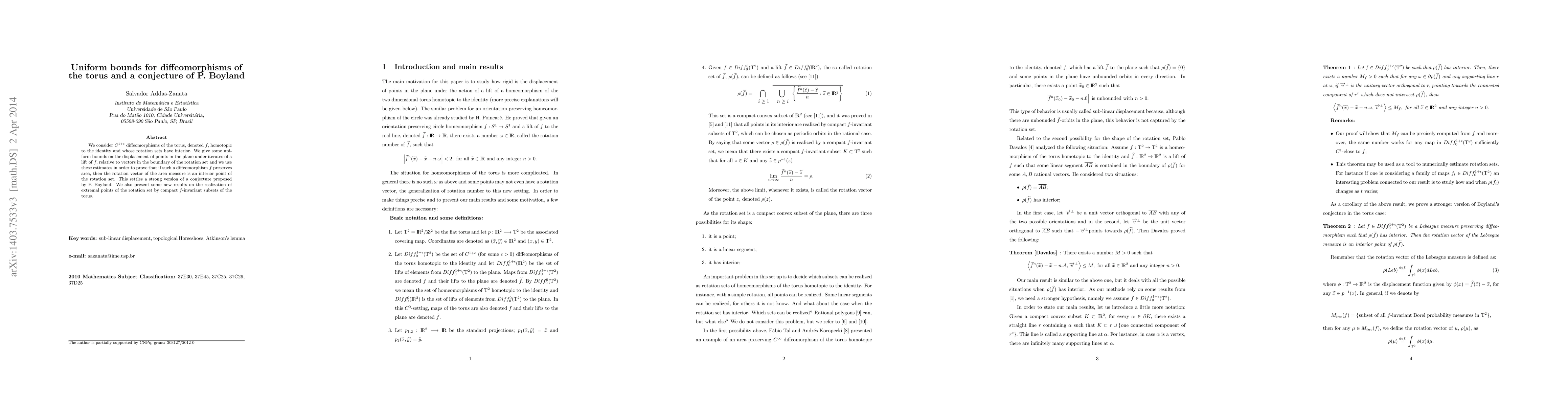 We consider $C^{1+\epsilon}$ diffeomorphisms of the torus, denoted $f,$ homotopic to the identity and whose rotation sets have interior. We give some uniform bounds on the displacement of points in the plane under iterates of a lift of $f,$ relative to vectors in the boundary of the rotation set and we use these estimates in order to prove that if such a diffeomorphism $f$ preserves area, then the rotation vector of the area measure is an interior point of the rotation set. This settles a strong version of a conjecture proposed by P. Boyland. We also present some new results on the realization of extremal points of the rotation set by compact $f$-invariant subsets of the torus.