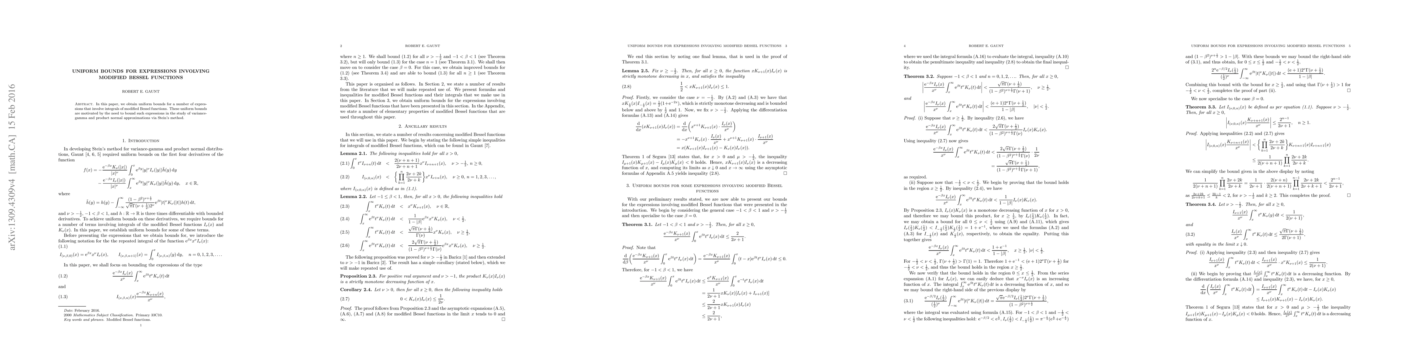 In this paper, we obtain uniform bounds for a number of expressions that involve derivatives and integrals of modified Bessel functions. These uniform bounds are motivated by the need to bound such expressions in the study of variance-gamma and product normal approximations via Stein's method.