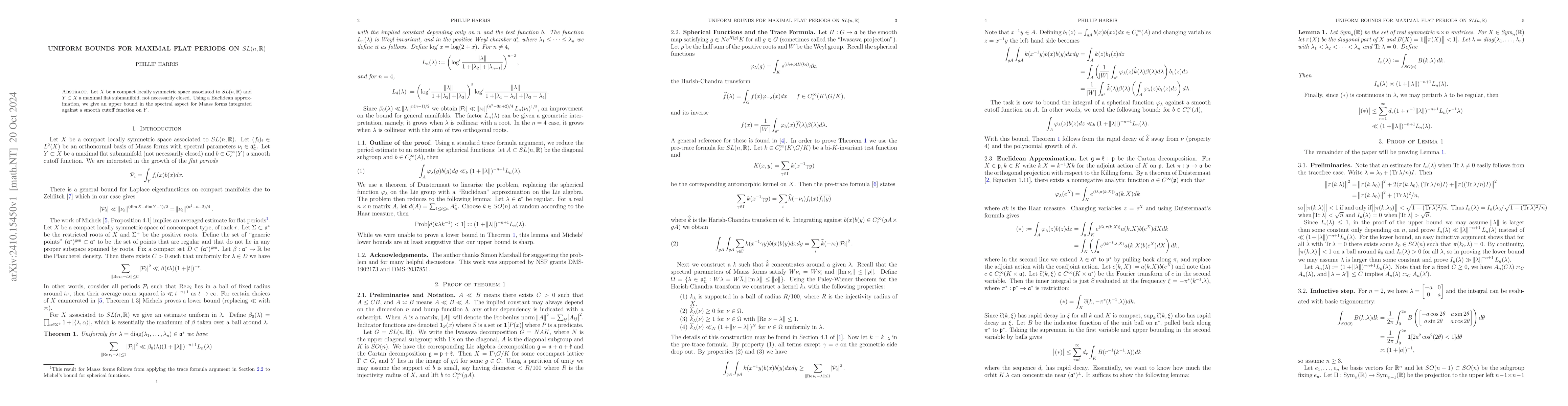 This paper provides uniform upper bounds for maximal flat periods on $SL_n(\mathbb{R})$ by studying compact locally symmetric spaces. It employs a Euclidean approximation to determine the spectral behavior of Maass forms integrated over maximal flat submanifolds.