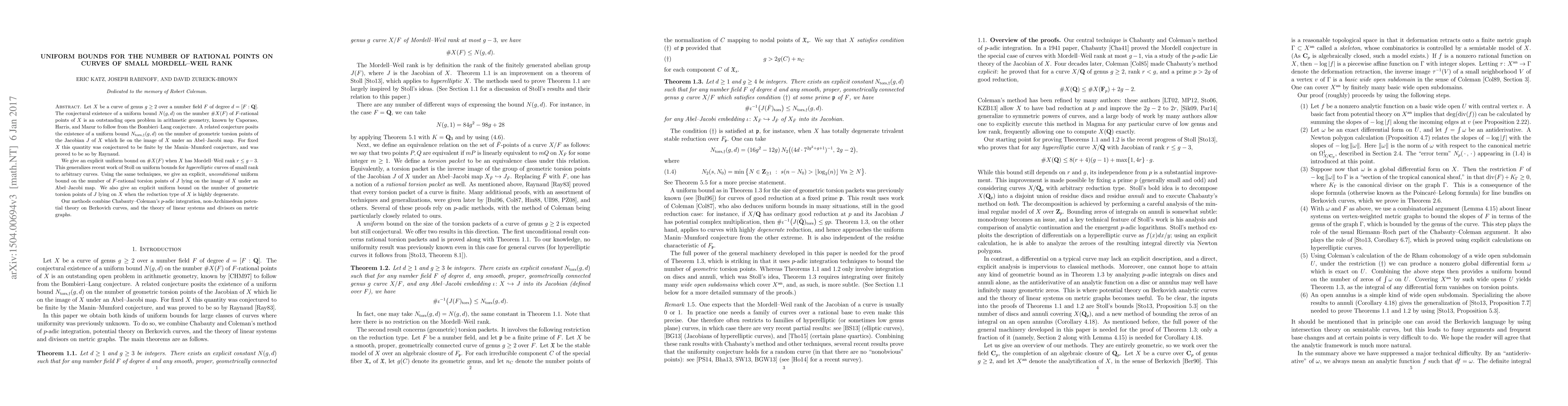 Let $X$ be a curve of genus $g\geq 2$ over a number field $F$ of degree $d = [F:Q]$. The conjectural existence of a uniform bound $N(g,d)$ on the number $\#X(F)$ of $F$-rational points of $X$ is an outstanding open problem in arithmetic geometry, known by [CHM97] to follow from the Bombieri--Lang conjecture. A related conjecture posits the existence of a uniform bound $N_{{\rm tors},\dagger}(g,d)$ on the number of geometric torsion points of the Jacobian $J$ of $X$ which lie on the image of $X$ under an Abel--Jacobi map. For fixed $X$ this quantity was conjectured to be finite by Manin--Mumford, and was proved to be so by Raynaud [Ray83]. We give an explicit uniform bound on $\#X(F)$ when $X$ has Mordell--Weil rank $r\leq g-3$. This generalizes recent work of Stoll on uniform bounds on hyperelliptic curves of small rank to arbitrary curves. Using the same techniques, we give an explicit, unconditional uniform bound on the number of $F$-rational torsion points of $J$ lying on the image of $X$ under an Abel--Jacobi map. We also give an explicit uniform bound on the number of geometric torsion points of $J$ lying on $X$ when the reduction type of $X$ is highly degenerate. Our methods combine Chabauty--Coleman's $p$-adic integration, non-Archimedean potential theory on Berkovich curves, and the theory of linear systems and divisors on metric graphs.