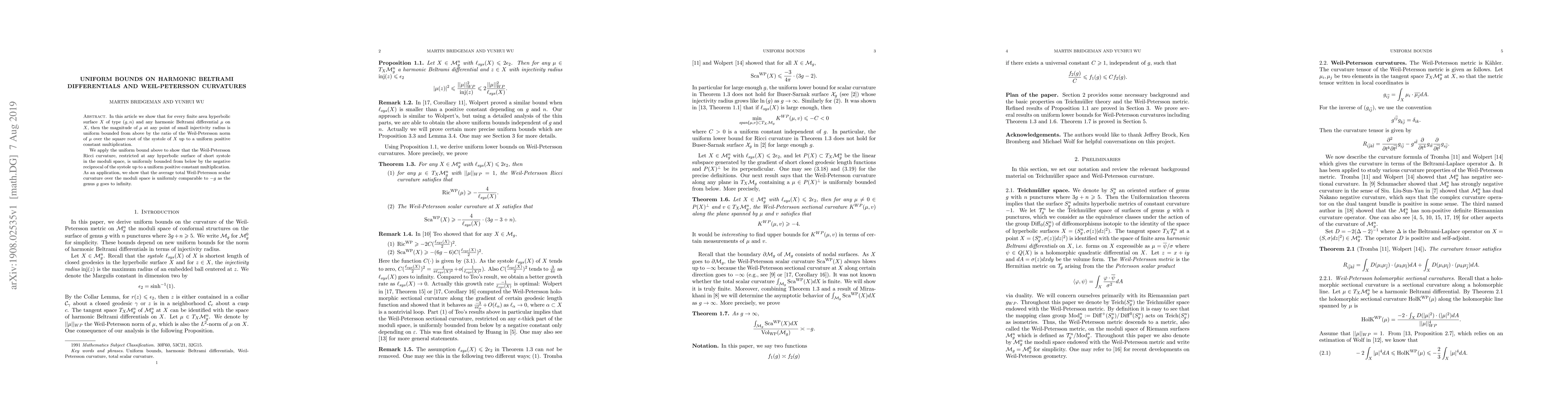 This paper establishes uniform bounds on harmonic Beltrami differentials and Weil-Petersson curvatures for finite area hyperbolic surfaces. It shows that the magnitude of a harmonic Beltrami differential is bounded by the ratio of its Weil-Petersson norm to the square root of the systole, leading to a uniform lower bound on the Weil-Petersson Ricci curvature.