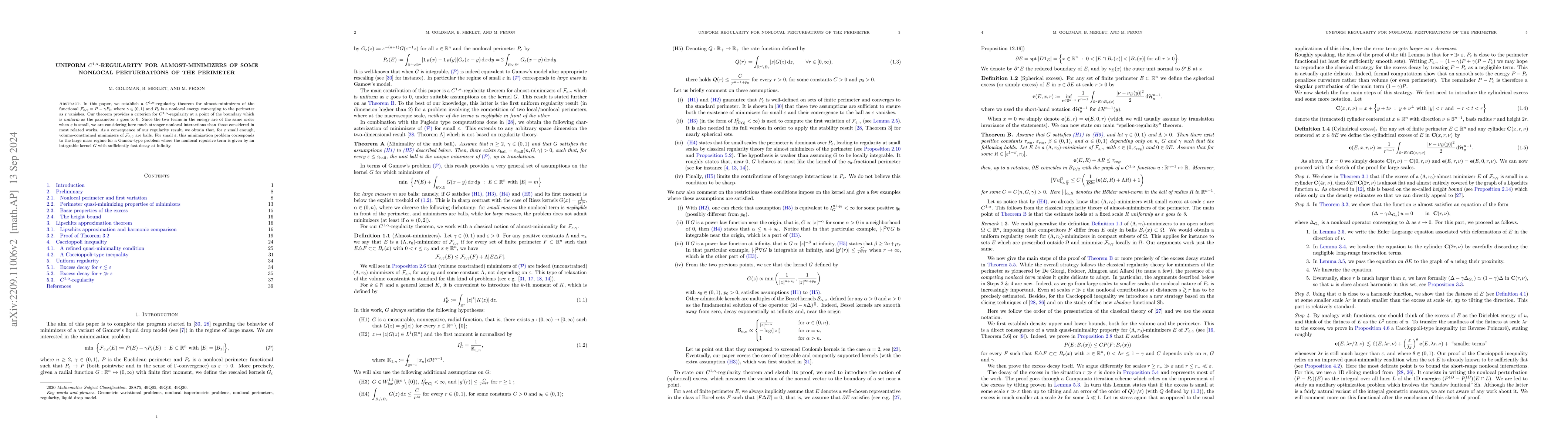 This paper proves a $C^{1,\alpha}$-regularity theorem for almost-minimizers of a functional combining perimeter and a nonlocal term, showing uniform regularity criteria as the nonlocal parameter approaches zero. It concludes that volume-constrained minimizers are nearly spherical for small nonlocal parameters.