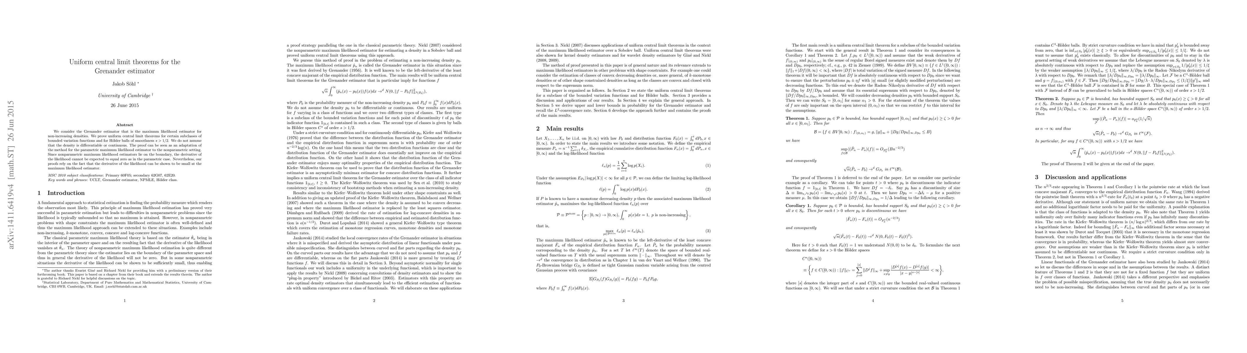 This paper proves uniform central limit theorems for the Grenander estimator, a maximum likelihood estimator for non-increasing densities, under conditions on bounded variation functions and H\"older smoothness. The proofs adapt the method used for parametric estimators to the nonparametric setting, focusing on the smallness of the likelihood derivative at the estimator.