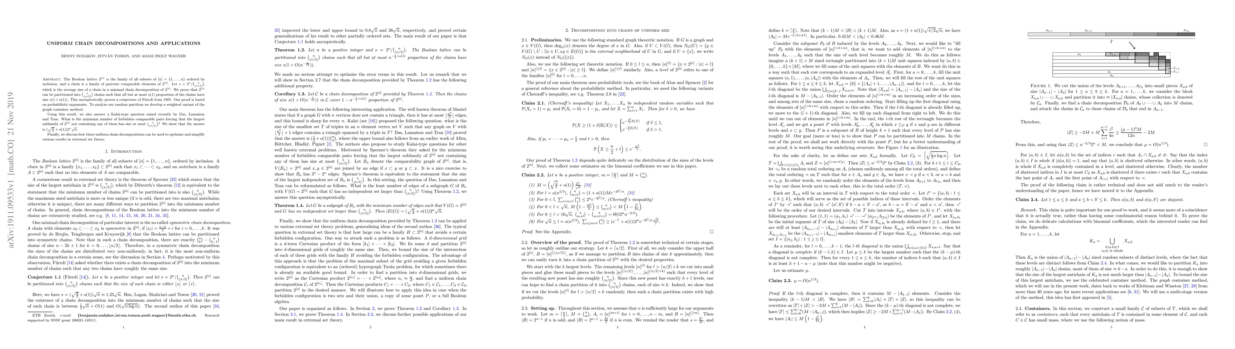The Boolean lattice $2^{[n]}$ is the family of all subsets of $[n]=\{1,\dots,n\}$ ordered by inclusion, and a chain is a family of pairwise comparable elements of $2^{[n]}$. Let $s=2^{n}/\binom{n}{\lfloor n/2\rfloor}$, which is the average size of a chain in a minimal chain decomposition of $2^{[n]}$. We prove that $2^{[n]}$ can be partitioned into $\binom{n}{\lfloor n/2\rfloor}$ chains such that all but at most $o(1)$ proportion of the chains have size $s(1+o(1))$. This asymptotically proves a conjecture of F\"uredi from 1985. Our proof is based on probabilistic arguments. To analyze our random partition we develop a weighted variant of the graph container method. Using this result, we also answer a Kalai-type question raised recently by Das, Lamaison and Tran. What is the minimum number of forbidden comparable pairs forcing that the largest subfamily of $2^{[n]}$ not containing any of them has size at most $\binom{n}{\lfloor n/2\rfloor}$? We show that the answer is $(\sqrt{\frac{\pi}{8}}+o(1))2^{n}\sqrt{n}$. Finally, we discuss how these uniform chain decompositions can be used to optimize and simplify various results in extremal set theory.