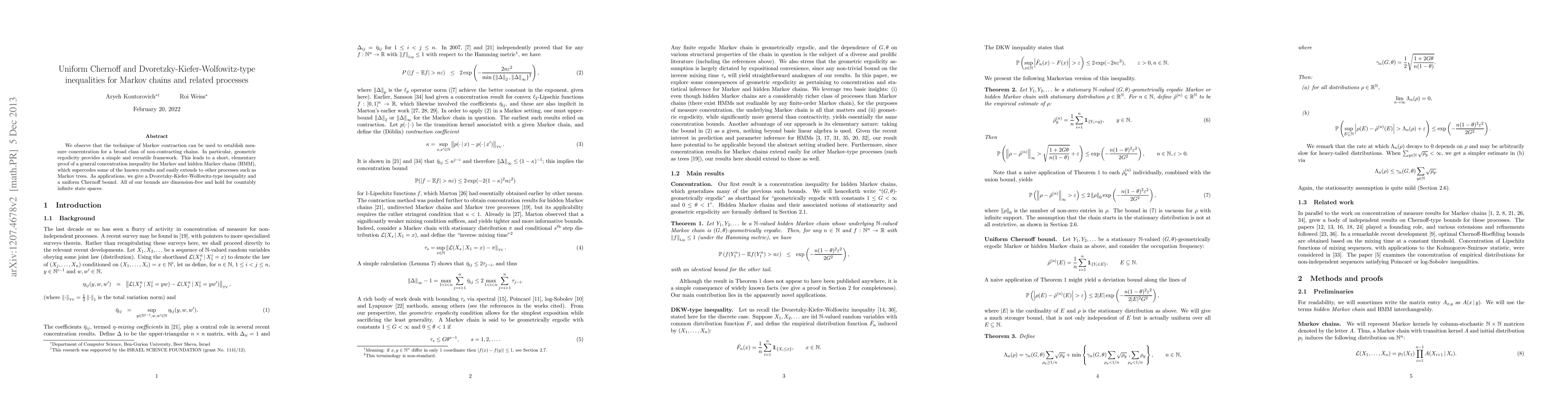 We observe that the technique of Markov contraction can be used to establish measure concentration for a broad class of non-contracting chains. In particular, geometric ergodicity provides a simple and versatile framework. This leads to a short, elementary proof of a general concentration inequality for Markov and hidden Markov chains (HMM), which supercedes some of the known results and easily extends to other processes such as Markov trees. As applications, we give a Dvoretzky-Kiefer-Wolfowitz-type inequality and a uniform Chernoff bound. All of our bounds are dimension-free and hold for countably infinite state spaces.