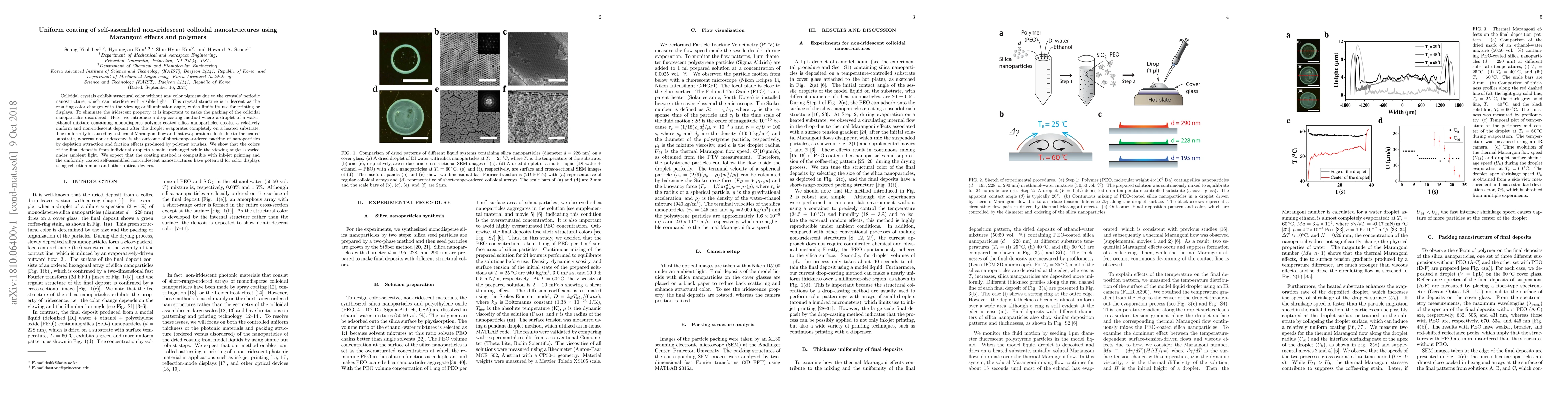 This paper presents a method for creating uniform, non-iridescent colloidal nanostructures using Marangoni effects and polymers, achieving stable colors across varying viewing angles. The technique involves drop-casting a water-ethanol mixture of polymer-coated silica nanoparticles on a heated substrate, leading to uniform deposits without iridescent properties.