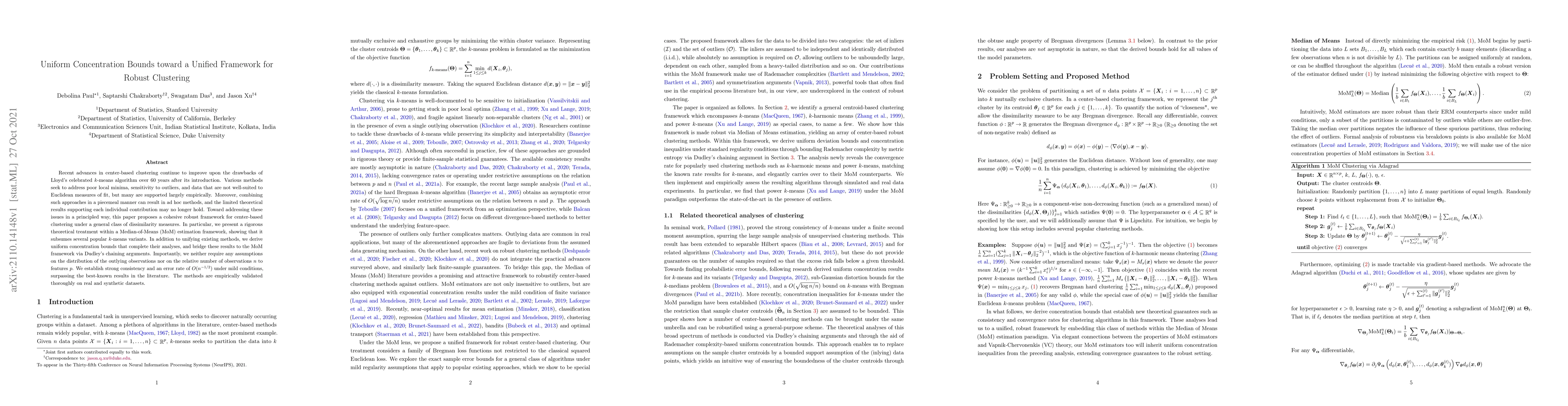 Recent advances in center-based clustering continue to improve upon the drawbacks of Lloyd's celebrated $k$-means algorithm over $60$ years after its introduction. Various methods seek to address poor local minima, sensitivity to outliers, and data that are not well-suited to Euclidean measures of fit, but many are supported largely empirically. Moreover, combining such approaches in a piecemeal manner can result in ad hoc methods, and the limited theoretical results supporting each individual contribution may no longer hold. Toward addressing these issues in a principled way, this paper proposes a cohesive robust framework for center-based clustering under a general class of dissimilarity measures. In particular, we present a rigorous theoretical treatment within a Median-of-Means (MoM) estimation framework, showing that it subsumes several popular $k$-means variants. In addition to unifying existing methods, we derive uniform concentration bounds that complete their analyses, and bridge these results to the MoM framework via Dudley's chaining arguments. Importantly, we neither require any assumptions on the distribution of the outlying observations nor on the relative number of observations $n$ to features $p$. We establish strong consistency and an error rate of $O(n^{-1/2})$ under mild conditions, surpassing the best-known results in the literature. The methods are empirically validated thoroughly on real and synthetic datasets.