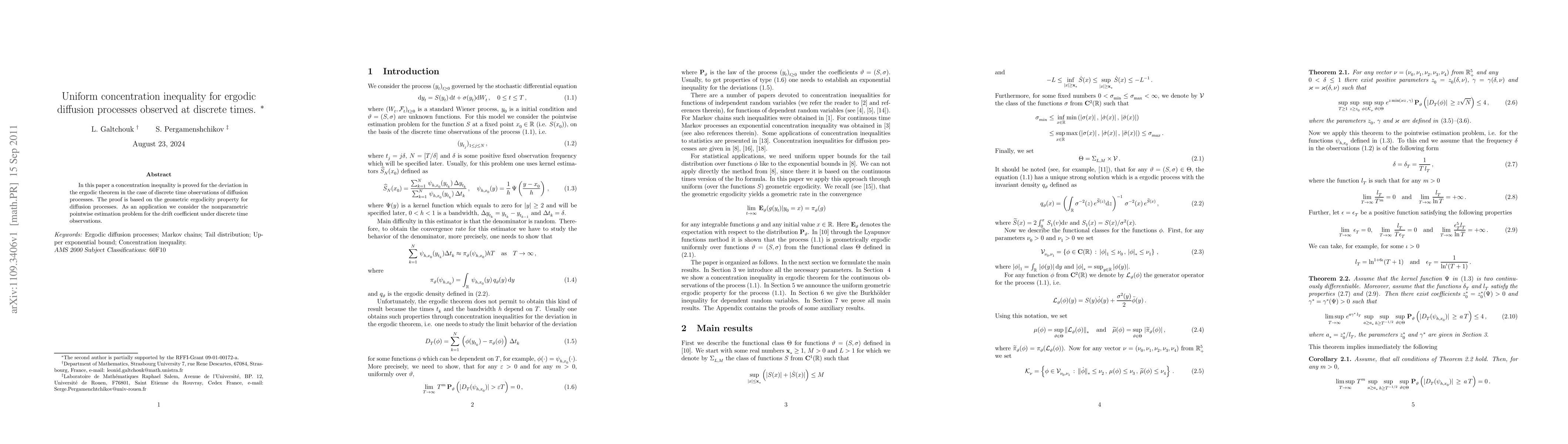 This paper establishes a uniform concentration inequality for deviations in the ergodic theorem for discrete time observations of diffusion processes, leveraging geometric ergodicity. It also applies the result to the nonparametric estimation of the drift coefficient under such observations.