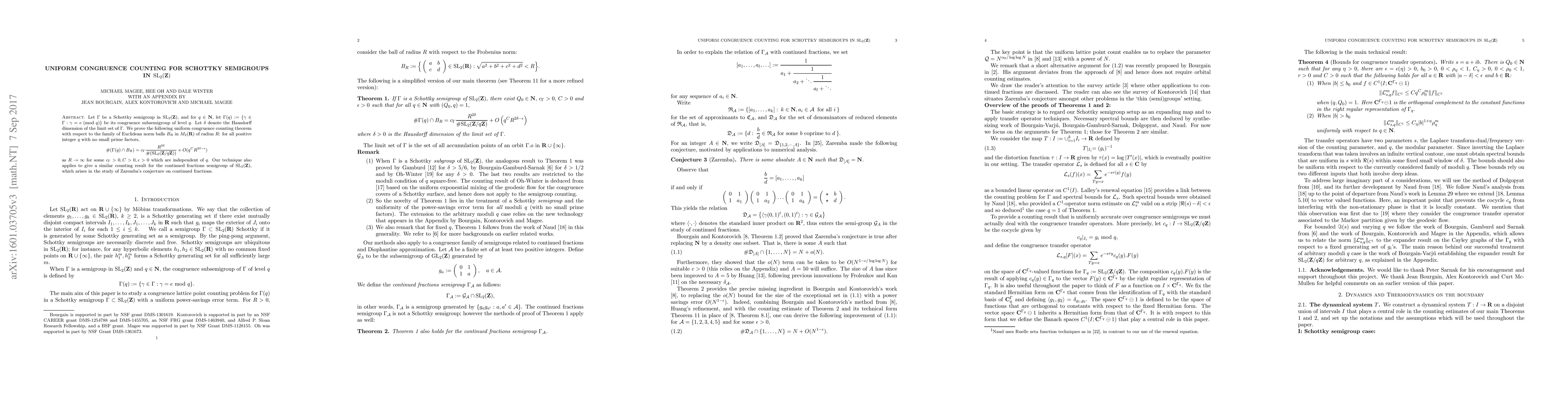 This paper proves a uniform congruence counting theorem for Schottky semigroups in $\mathrm{SL}_2(\mathbf{Z})$, showing that the number of elements in congruence subsemigroups within Euclidean norm balls grows proportionally to $R^{2\delta}$ as $R$ tends to infinity, with error terms dependent on $q$. The technique is also extended to the continued fractions semigroup relevant to Zaremba's conjecture.