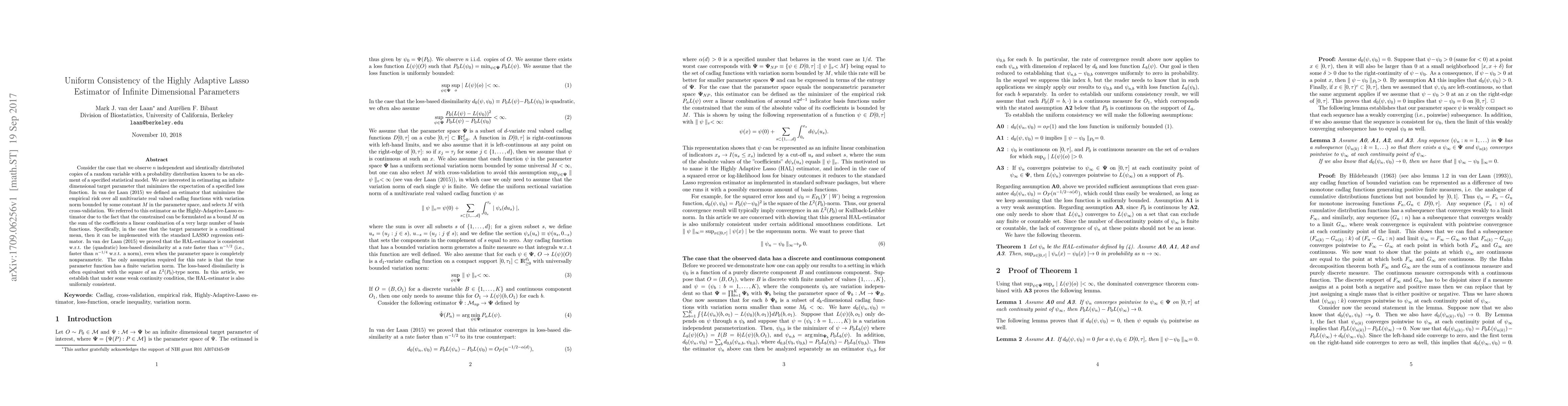 This paper investigates the uniform consistency of the Highly Adaptive Lasso (HAL) estimator for infinite-dimensional parameters, proving that it is consistent at a rate faster than $n^{-1/2}$ under a finite variation norm assumption. The authors establish uniform consistency under a weak continuity condition.